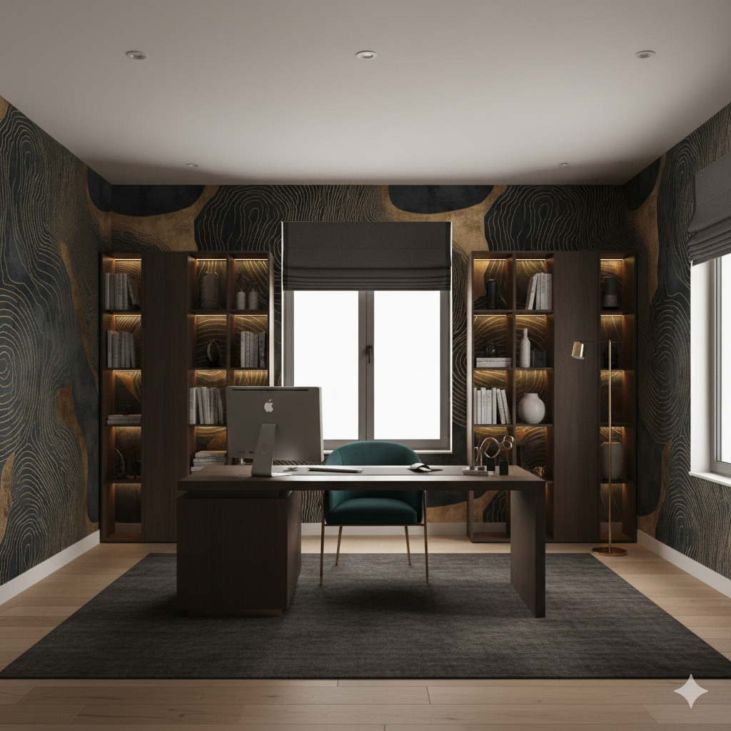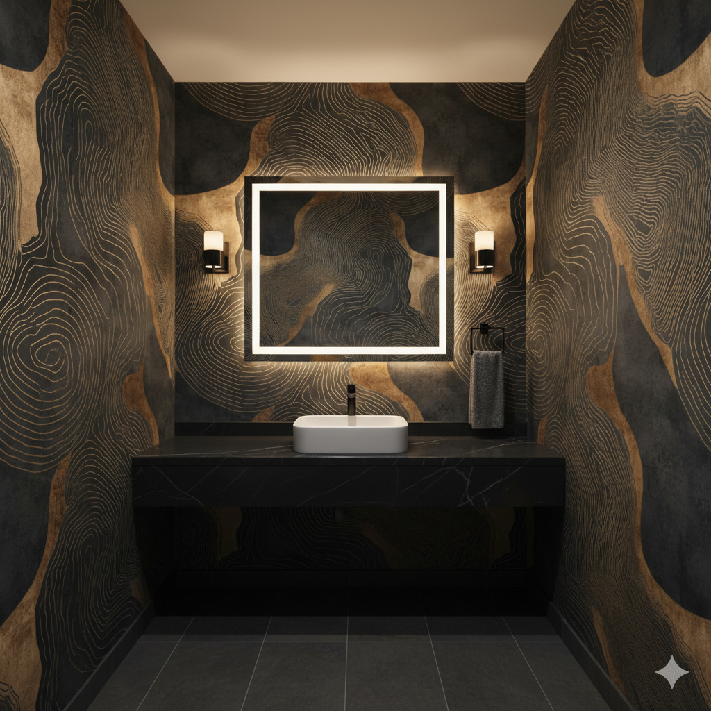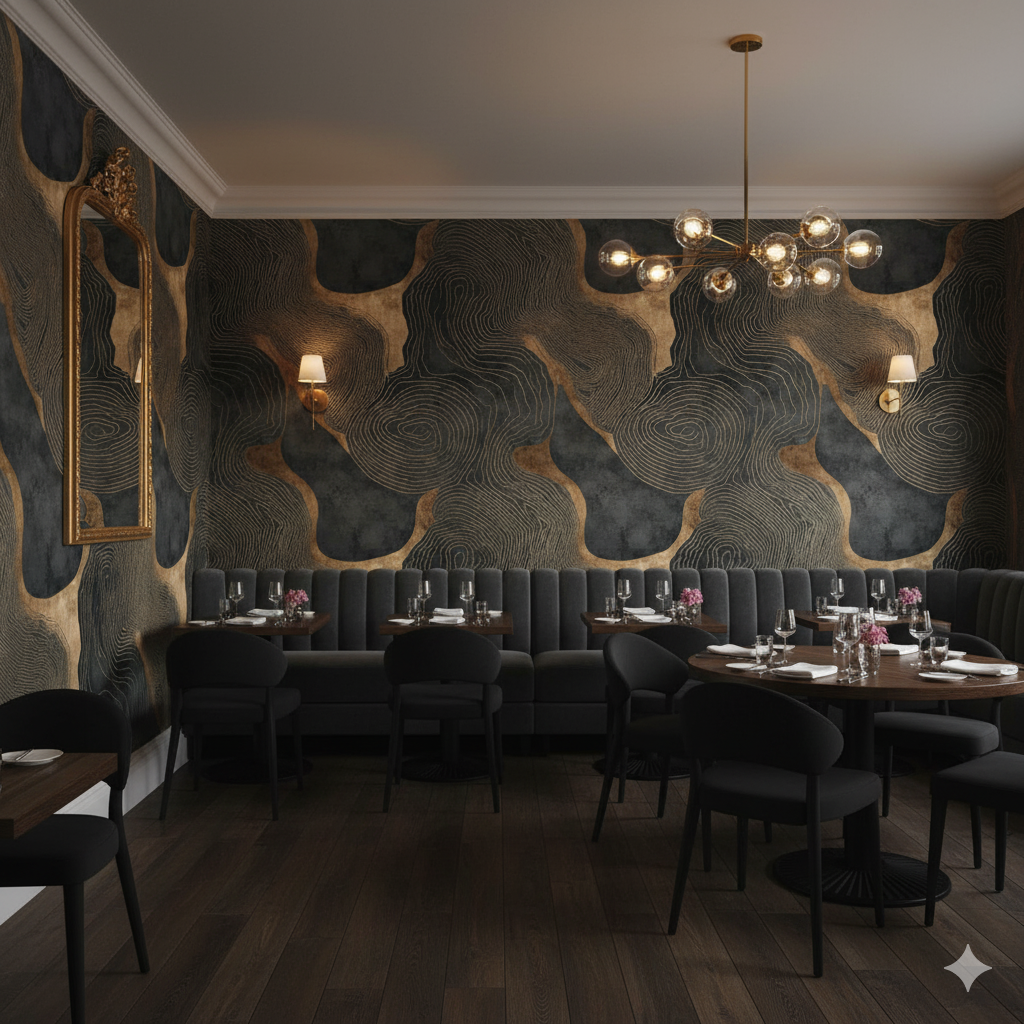 This design reimagines natural topography as art, with sweeping metallic contour lines etched across a dark, moody ground. The golden strokes flow like elevation maps or rings of ancient wood, their shimmer standing in contrast to the matte charcoal backdrop. It feels at once organic and luxurious—rooted in the language of the land yet elevated to high design. This wallpaper transforms offices, dining spaces, or hotel lobbies into environments of sophistication and quiet drama. Pair with matte black fixtures, stone accents, or minimalist furniture to let the metallic mapping take center stage.