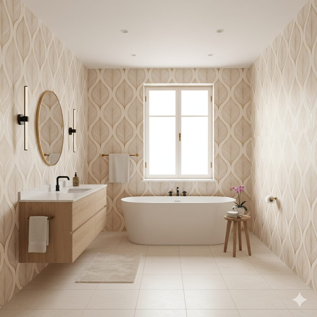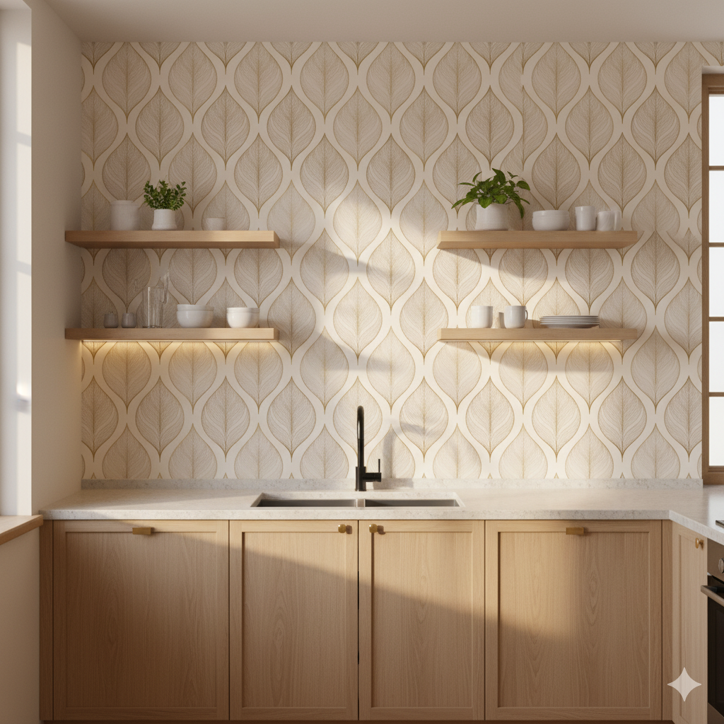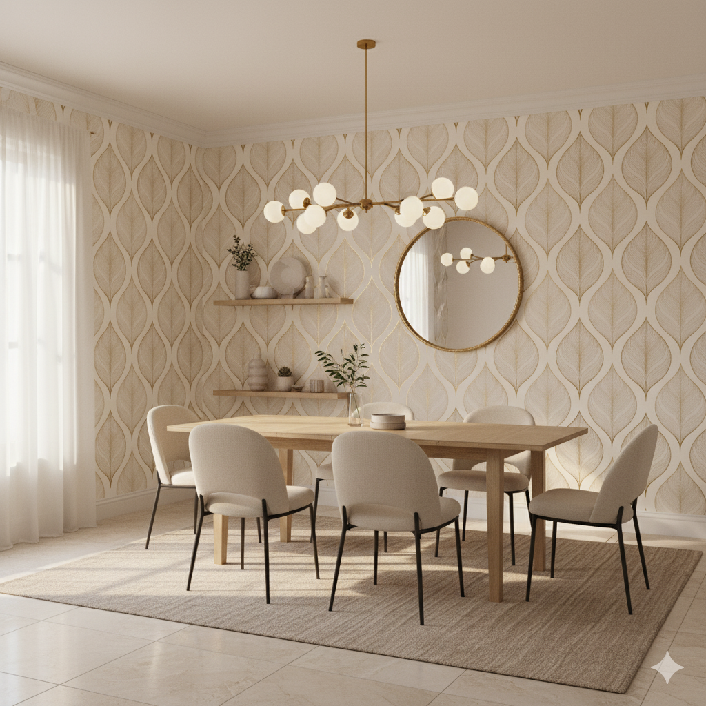 This pattern captures the refined elegance of stylized leaf silhouettes outlined in warm metallic gold against a soft ivory ground. The elongated, symmetrical leaf shapes have a rhythm and balance that feels both organic and architectural, making it equally suited for traditional and modern interiors. The faint shimmer of the gold detailing elevates the design, giving it a subtle touch of glamour without overwhelming the room. Perfect for dining rooms, foyers, or boutique-style retail spaces, Aurelia Leaf adds a timeless richness that pairs well with brass fixtures, velvet upholstery, and warm neutral palettes. Its restrained luxury makes it a strong contender for creating a sophisticated yet approachable atmosphere.