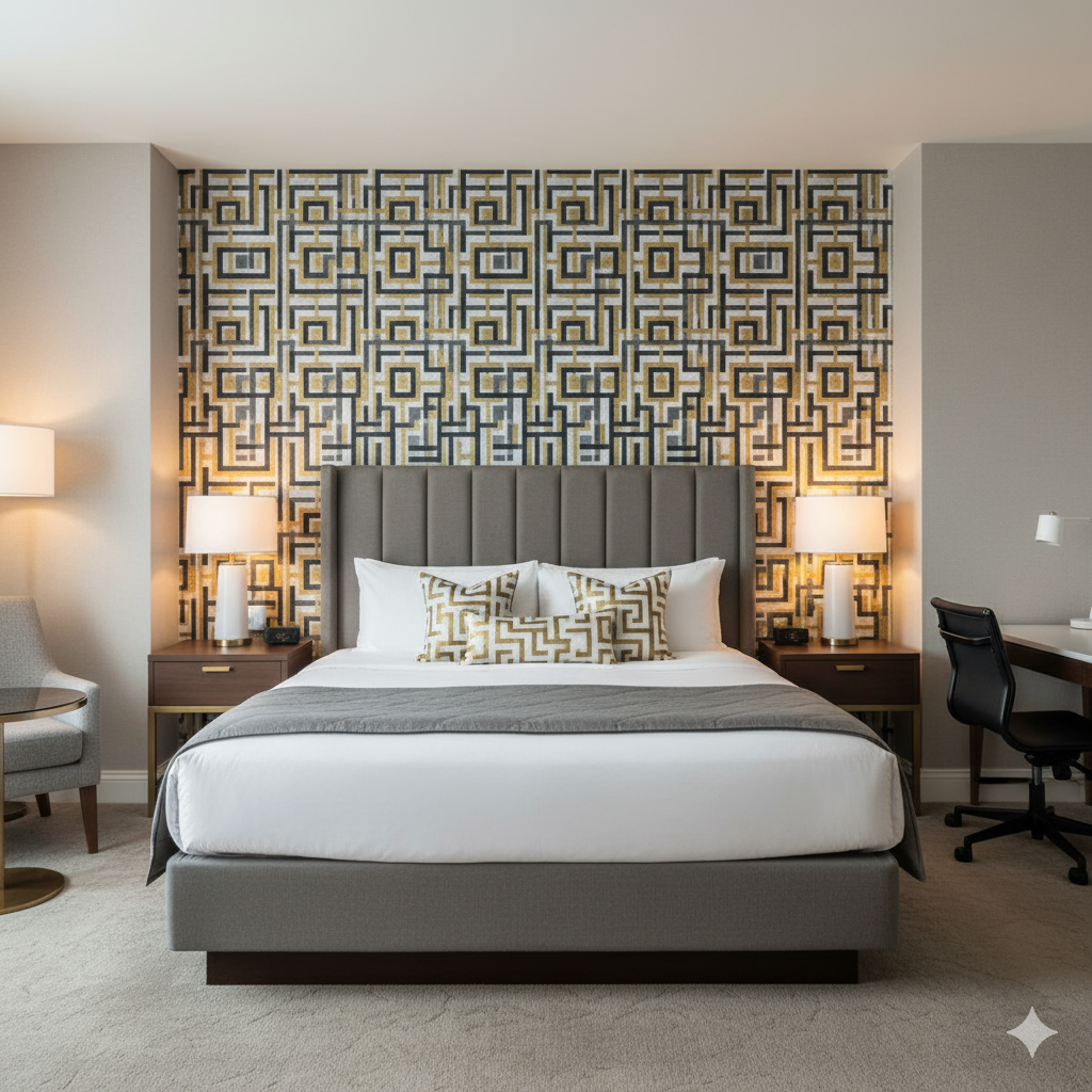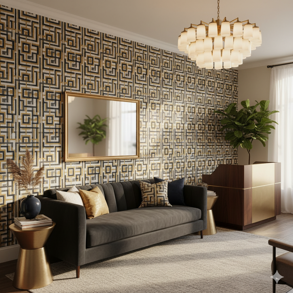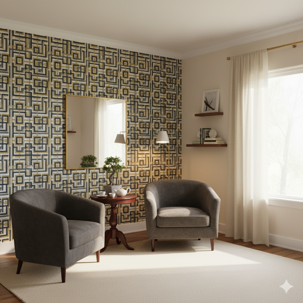 This geometric design reimagines the classic Greek key motif in a bold, modern format. Interlocking squares and lines in deep charcoal and warm gold form a labyrinthine pattern across a textured gray background. The result is striking, architectural, and sophisticated. Perfect for office spaces, entry halls, or modern living rooms, this wallpaper introduces structure and luxury in equal measure. It complements contemporary interiors with marble, glass, or metallic finishes, while also bringing depth and order to eclectic design schemes.