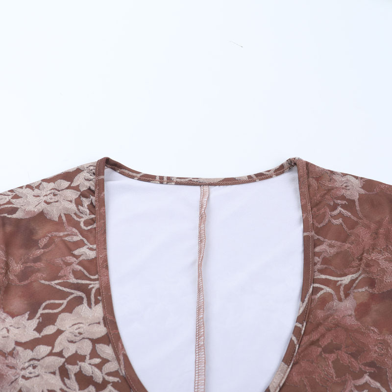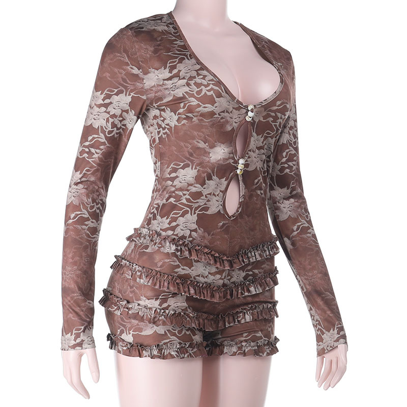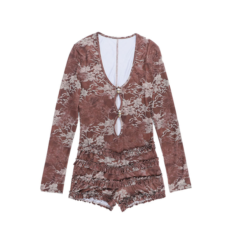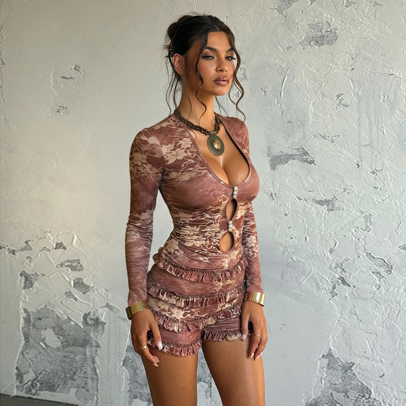 Autumn Winter Sexy Tight Deep V Plunge Long Sleeve Printing Romper