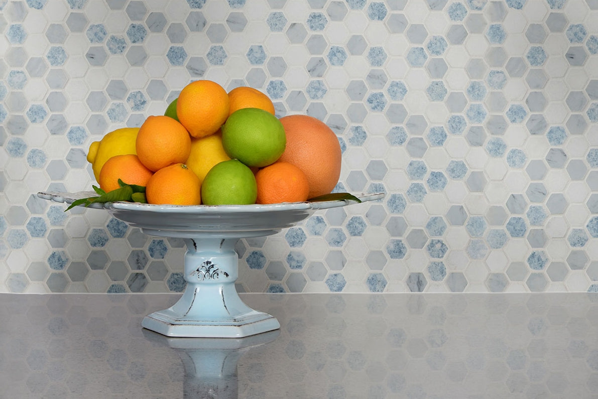 Azula Hexagon Mosaic Tile features an iconic shape in a playful updated pattern that includes 1-inch hexagons in luxurious marble. The creamy whites, grays, and blues make a style statement without overpowering. It's suitable for a wide range of applications that include a stunning hexagon tile backsplash to unique countertops to a pretty hexagon bathroom tile that can be used in so many ways. This backsplash tile is Greenguard Indoor Air Quality Certified® and comes mounted on mesh-backed sheets for simplified installation and a professional finish.