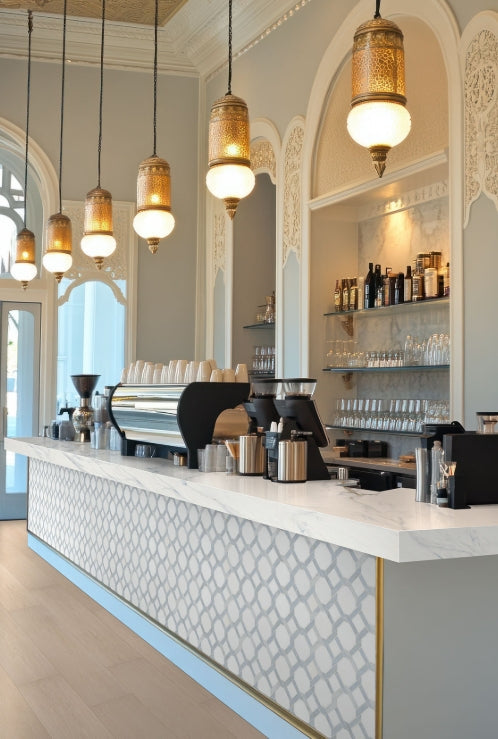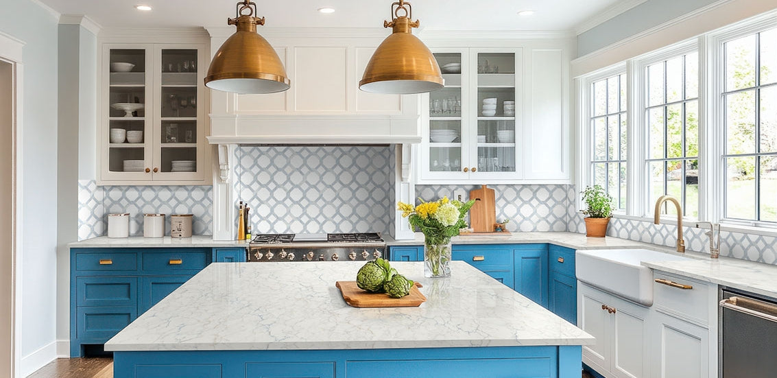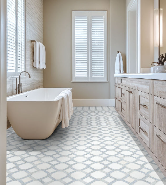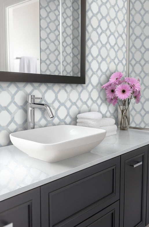 Azula Kaya Mosaic Tile features a striking geometric pattern in light blue and gray set against a polished white marble backdrop. The mesh backing allows for easy installation, making it an excellent choice for creating stylish accent walls, backsplashes, and even residential floors. This sophisticated tile brings a fresh, modern touch to any interior space with its elegant design and luxurious finish.
