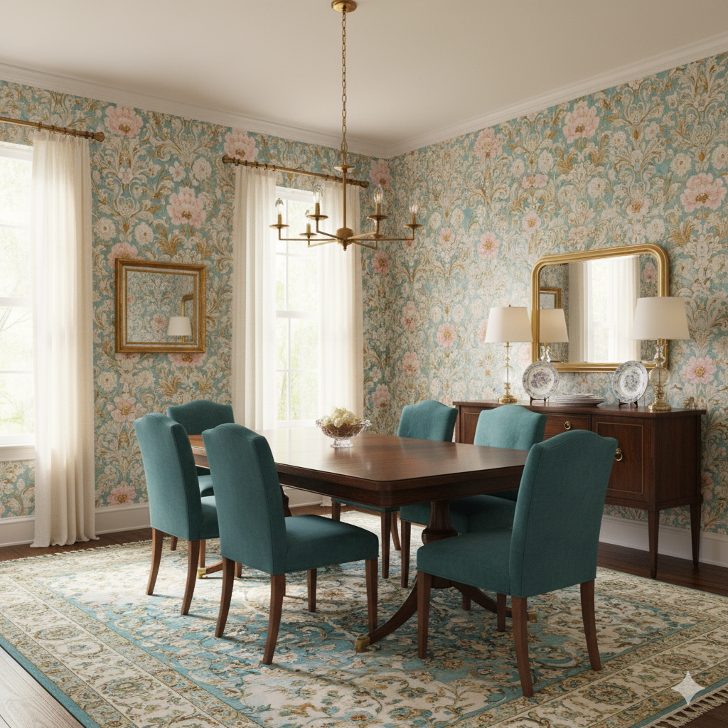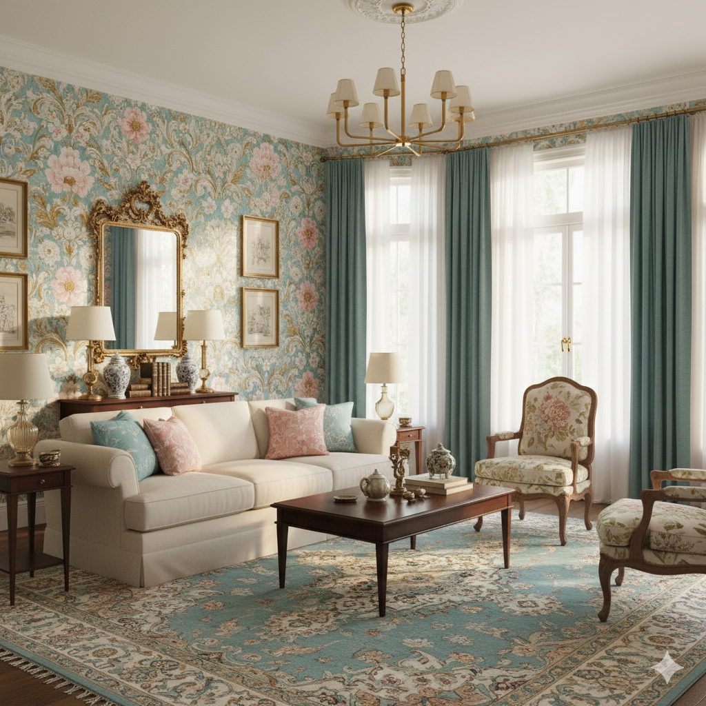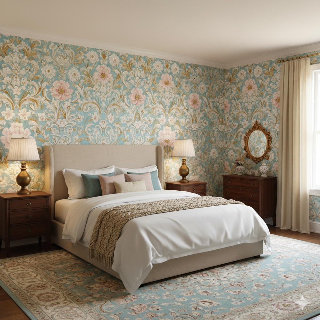 Set against a turquoise-blue ground, this richly ornamental design blends sweeping acanthus-like scrolls with soft florals in blush, ivory, and gilded tones. It is maximalist in spirit, unapologetically decorative, with painterly texture that recalls oil painting on canvas. The intricate swirls add drama, while the color palette keeps it uplifting rather than heavy. This design is well-suited for luxurious interiors — boutique hotels, ballrooms, or statement living spaces — where one wants to achieve the layered opulence of a European palace without feeling outdated. Its balance of blue and gold feels regal, yet playful enough to be adapted to eclectic styling.