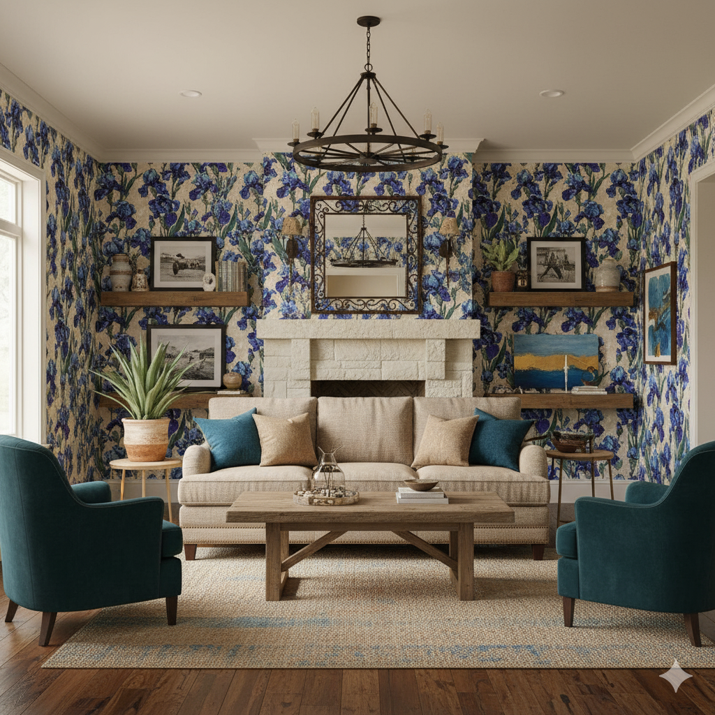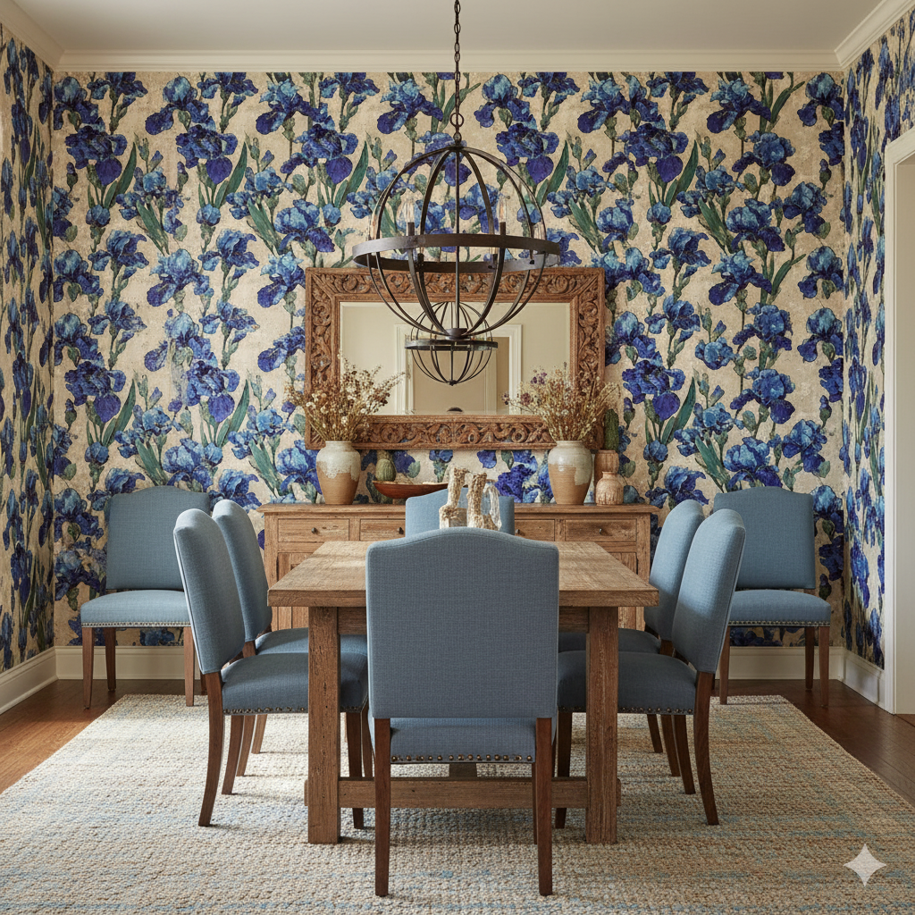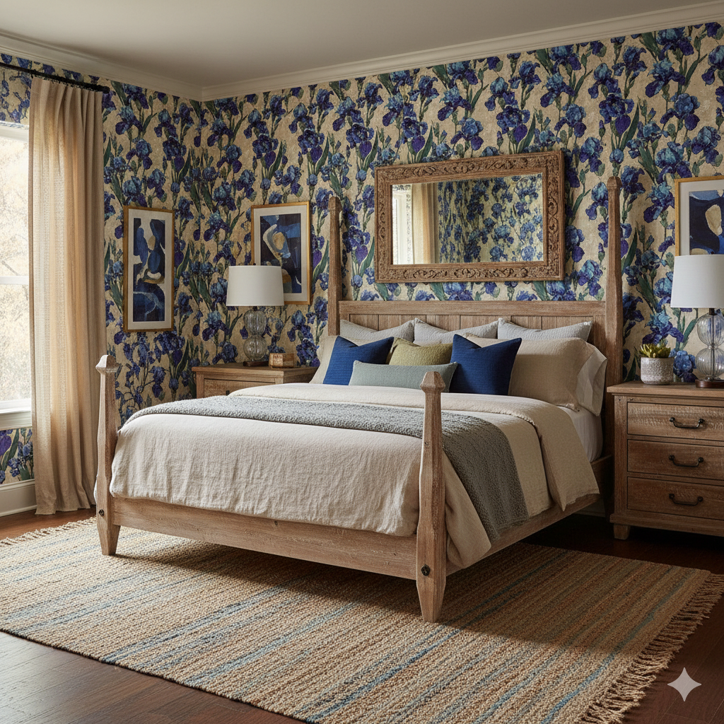 Vivid shades of ultramarine and violet leap off a parchment-toned background in this iris-filled composition. The loose, gestural brushwork enhances the wild energy of blossoms, creating a striking balance of structure and spontaneity. This wallpaper works beautifully in dining rooms, conservatories, or art-focused interiors where bold color takes center stage. It harmonizes with cool stone, muted neutrals, and metallic finishes in silver or pewter.