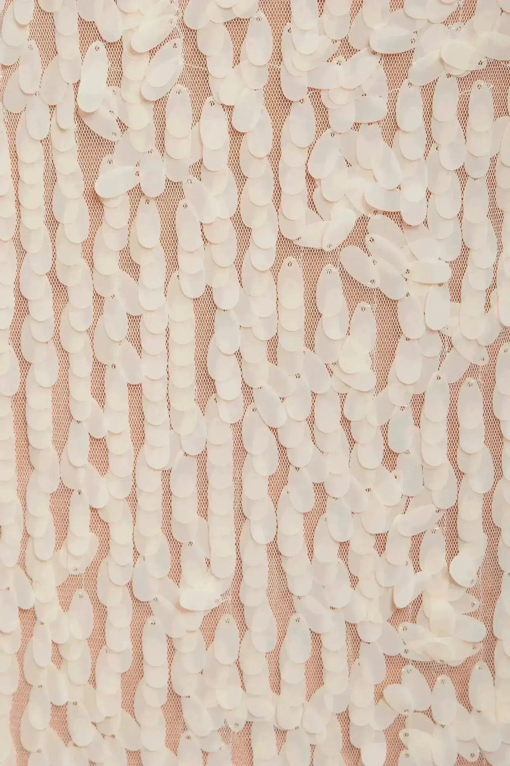 Our Lucille backless mini dress takes inspiration from the roaring 1920s with large oval sequins adorning a nude mesh cut high on the neck.