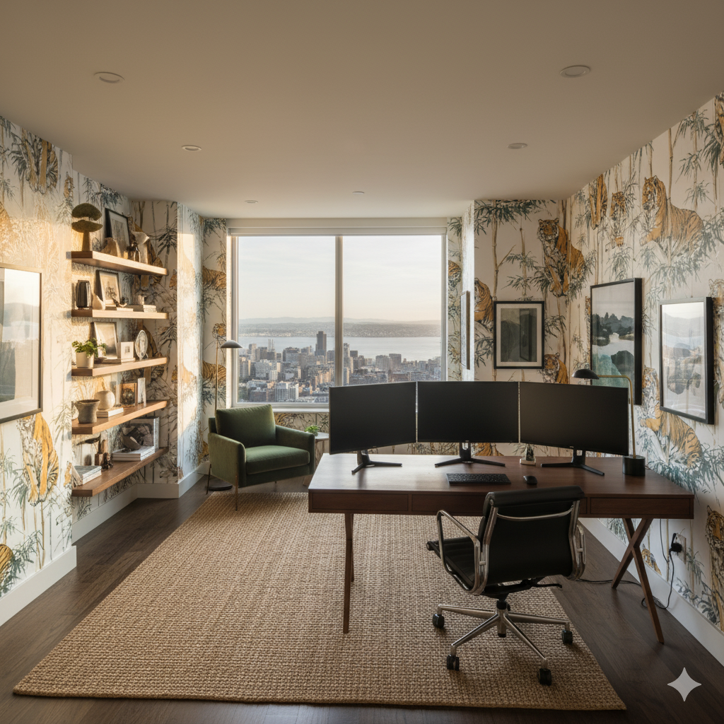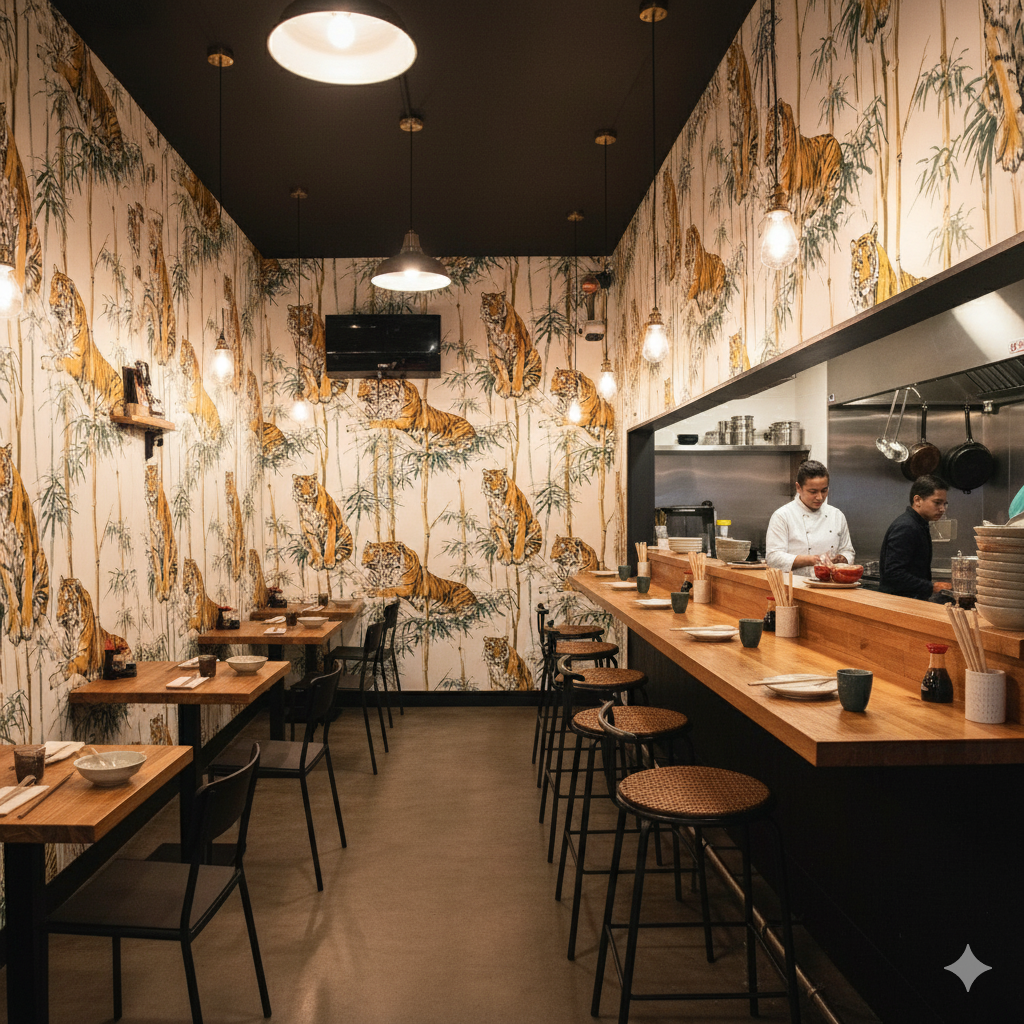 "Bamboo Royalty" is a striking wallpaper that features majestic Bengal tigers lounging and prowling through a delicate bamboo grove. Rendered in expressive brushstrokes of ochre, charcoal, and forest green, the composition is rich with texture and regal poise. The clean white background adds contrast and airiness, allowing each detail of the tiger’s coat and bamboo leaves to stand out vividly. Ideal for accent walls, powder rooms, eclectic offices, or safari-inspired nurseries, this wallpaper evokes wild elegance with an artistic flair.