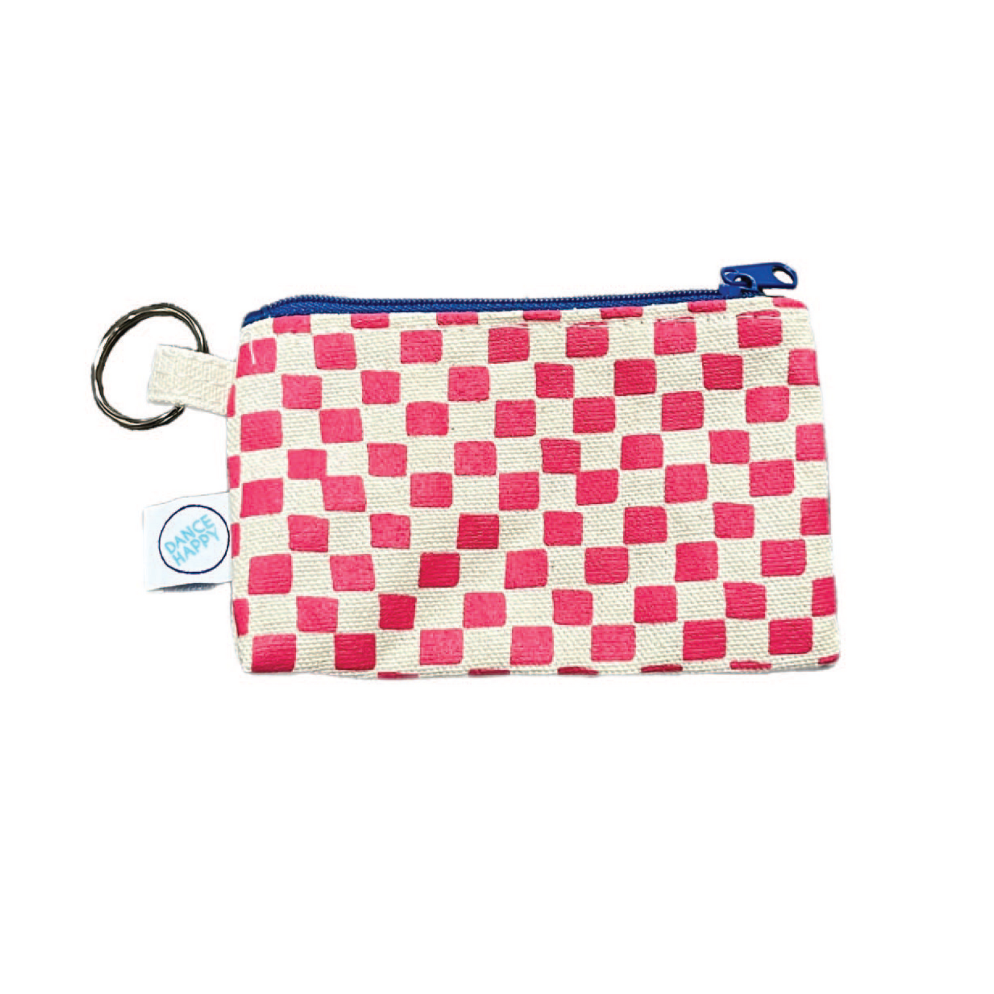 Darling cardholder with "Be Kind to All Kinds" on one side and a bold pattern on the other, both screenprinted in rose. The perfect size to fit your cards, some cash, and attach your keys without taking up a lot of room in your bag. Metal keyring and blue colored zipper.