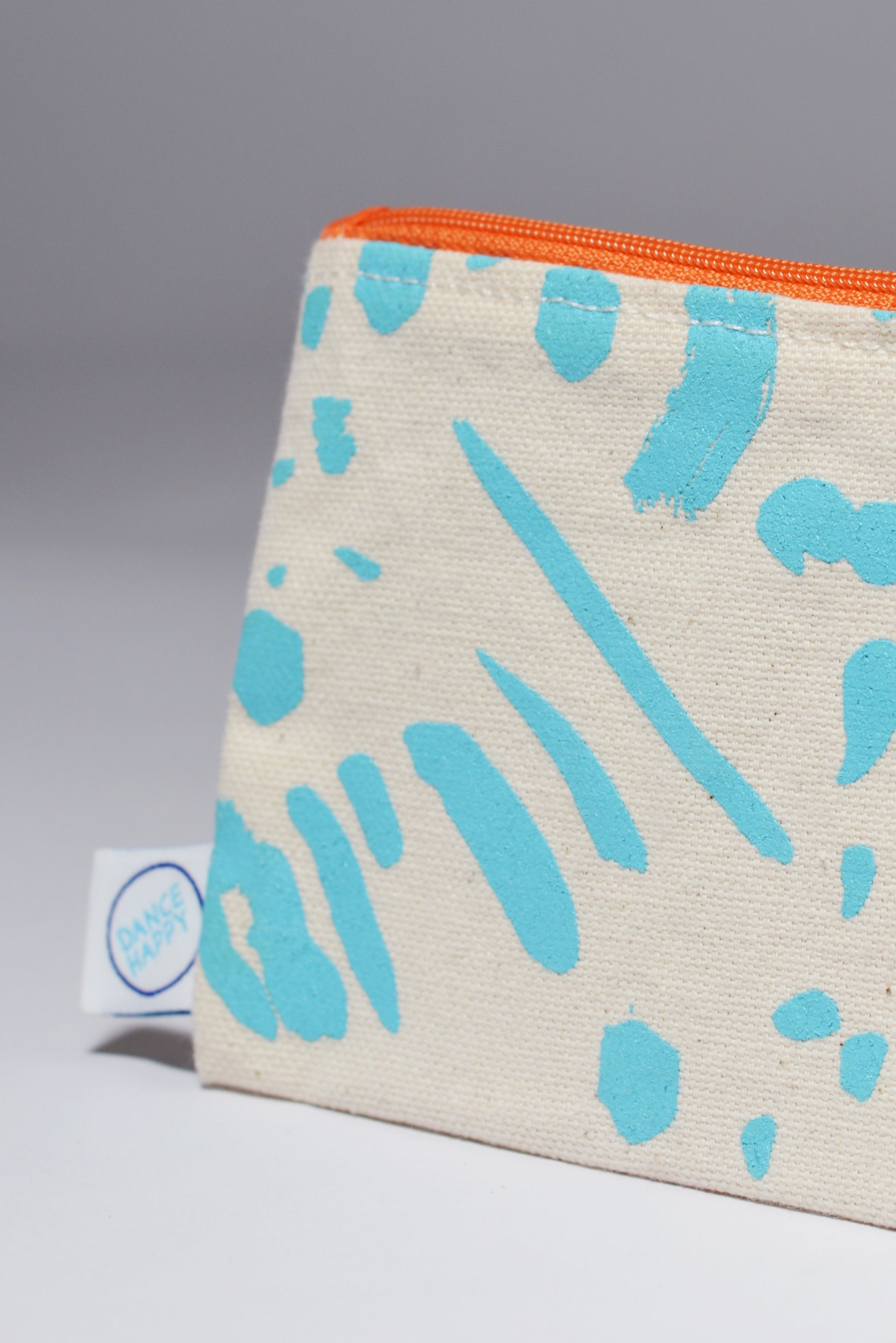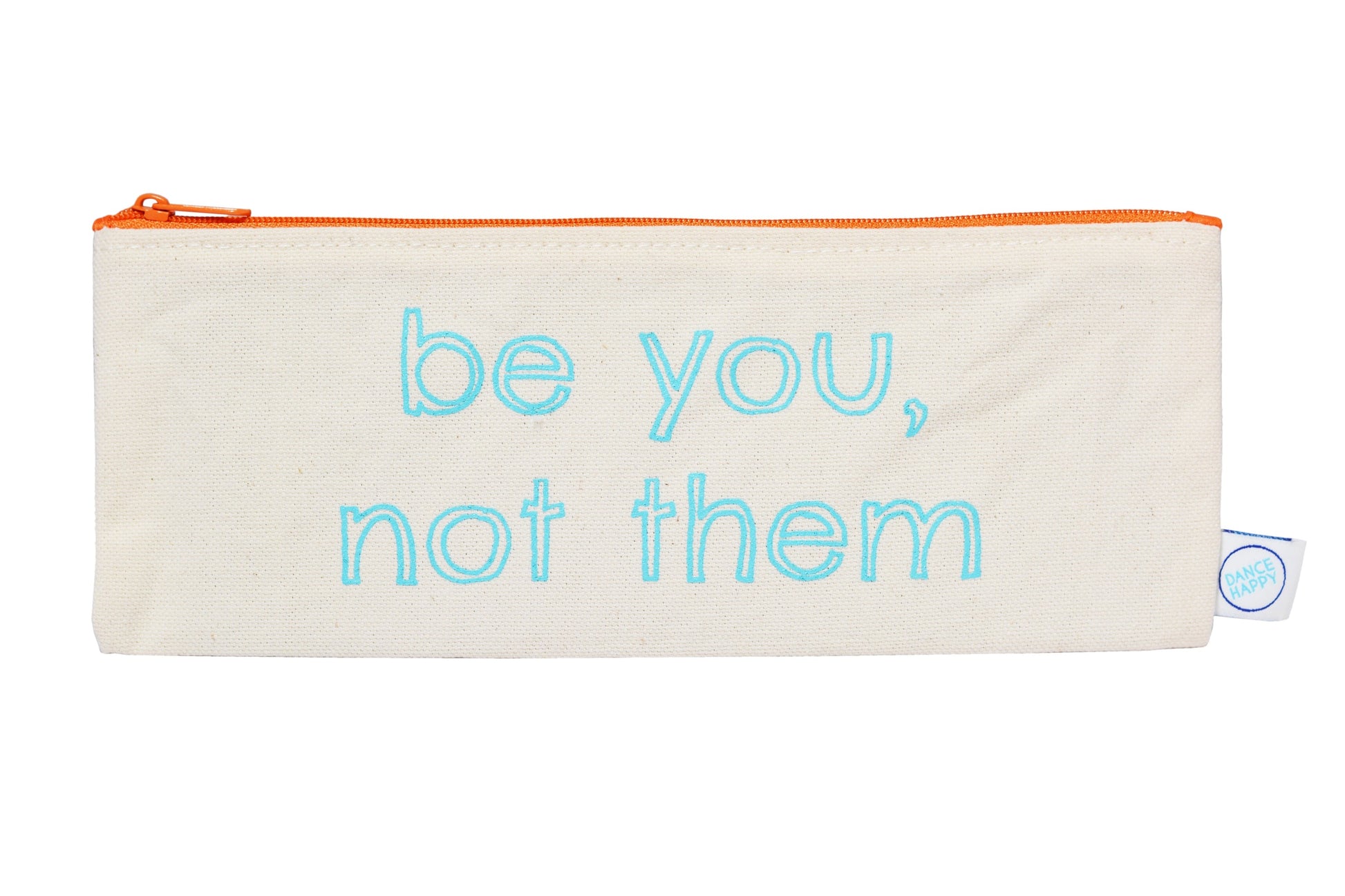 Eco-friendly cotton canvas pencil case with a colored zipper along the top to keep all your treasures secure. Perfect for pencils, art supplies, knick-knacks, or even make-up brushes. This zip case features the words "Be You, Not Them" on one side and a hand drawn abstract pattern on the other, both of which are screenprinted in aqua. Complementing orange zip top.