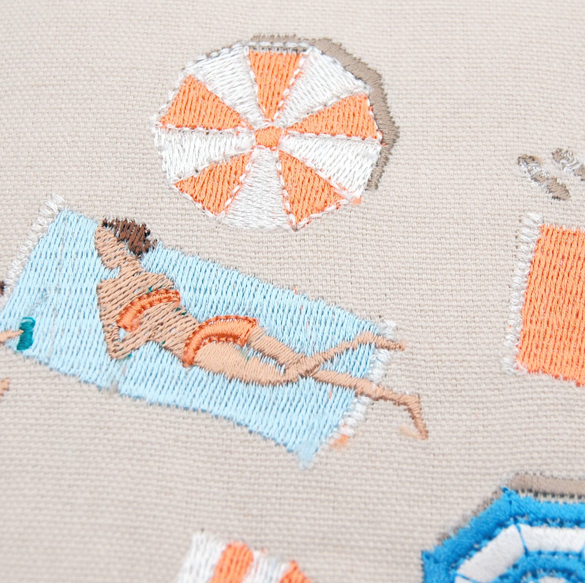 Bring coastal charm into your space with our Beach Bound Indoor Throw Pillow. This fun and funky design captures the essence of a laid-back summer day with a bird's-eye view of sunbathers, umbrellas, and ocean waves. Heavily embroidered in shades of blue, coral, white, and tan, the beach scene pops against a soft sandy beige and coastal blue background. Crafted from quality cotton with a buttoned envelope back, this 20" square pillow is as practical as it is charming. Whether used as a playful accent on a sofa or bed, it brings a splash of summer into any room.