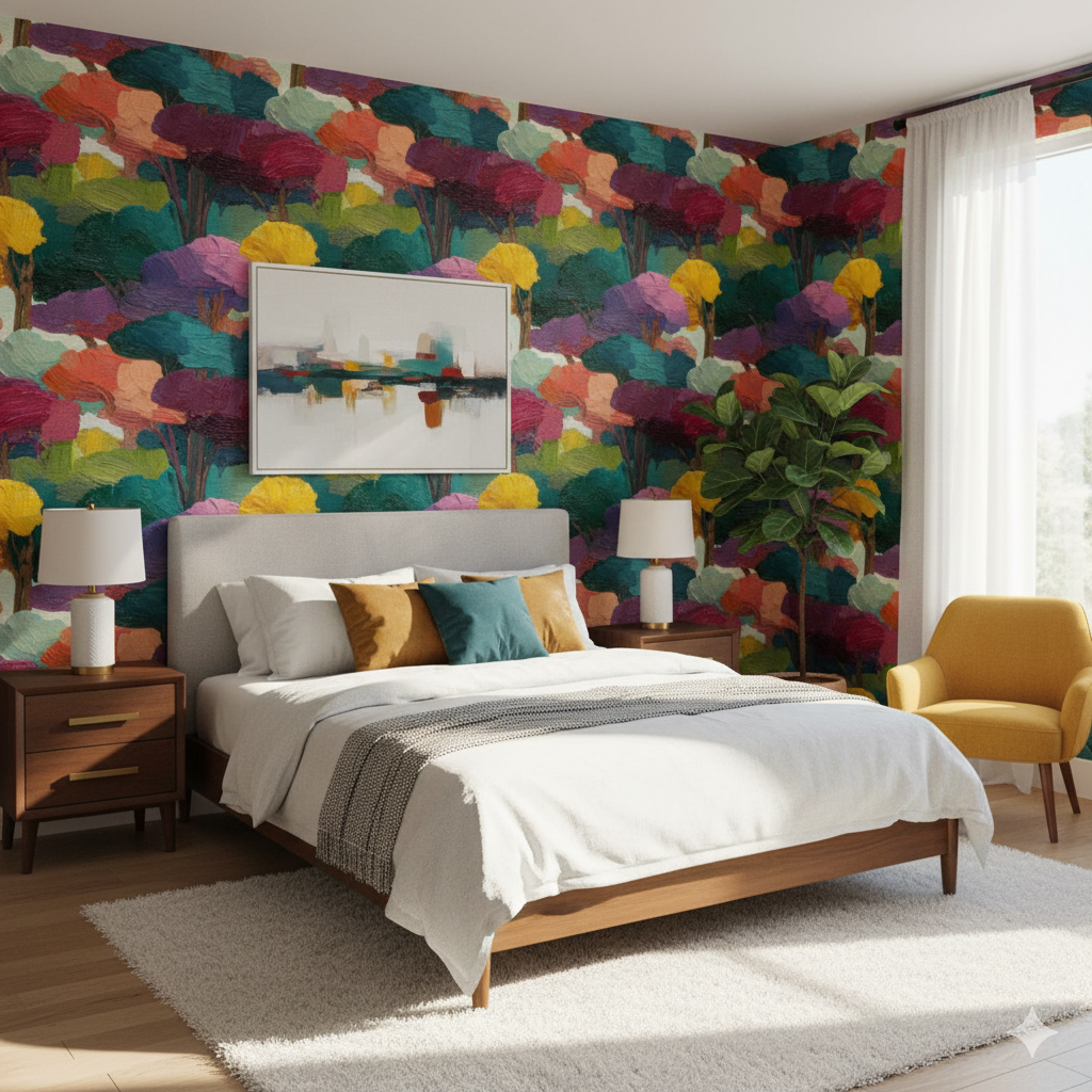 Belladonna Grove evokes the mystique of a painted forest at the edge of imagination — where brushstrokes become canopies, and color breathes like living light. Deep emeralds, plum purples, coral oranges, and ochre yellows intertwine in lush, impasto texture, resembling treetops glimpsed through afternoon haze. The palette feels both dreamlike and grounded — rich yet soothing. This wallpaper transforms any room into a poetic escape, perfect for moody dining rooms, art-forward offices, or bedrooms that crave warmth without predictability. Paired with walnut tones, matte brass, or velvet upholstery, it exudes painterly sophistication reminiscent of a 20th-century expressionist landscape.