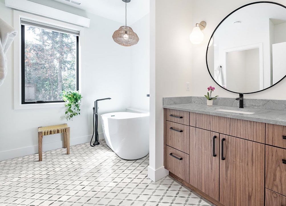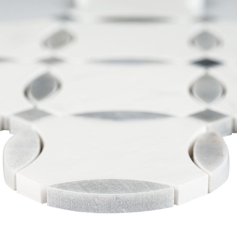 Bianco Dolomite Lola Tile exudes a timeless allure, elevating any room. Its cool white color palette, adorned with graceful gray accents, seamlessly complements a variety of architectural design schemes. This mosaic tile features a unique geometric pattern that creates a refined modern touch. Crafted from genuine marble, this tile boasts a sleek polished finish, radiating elegance throughout any space. The mesh backing ensures easy installation and guarantees a polished and professional outcome. Whether applied to inviting kitchen backsplashes, bathroom walls, fireplace surrounds, or shower walls, the Bianco Dolomite Lola Tile effortlessly transforms residential rooms into an inviting oasis of comfort and style.