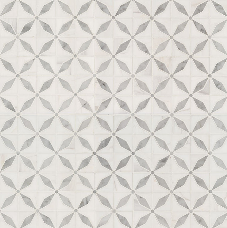 Bianco Starlite Marble Geometric Tile will pretty up any space with the white marble geometric tiles with modern star-like shapes in gray. The neutral color and design of this backsplash tile complement any design style, and they can be featured as patterned wall tiles, kitchen or bathroom countertops, and geometric floor tiles.