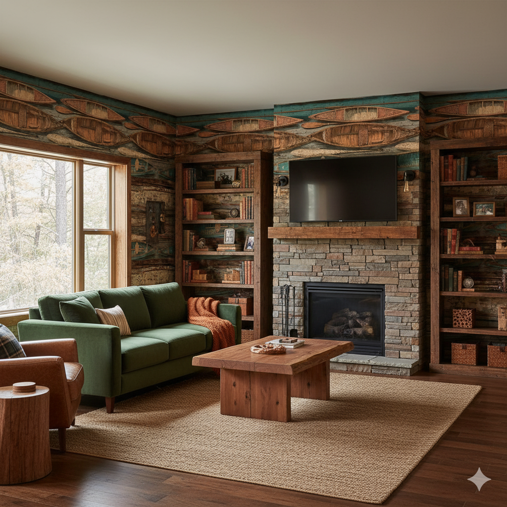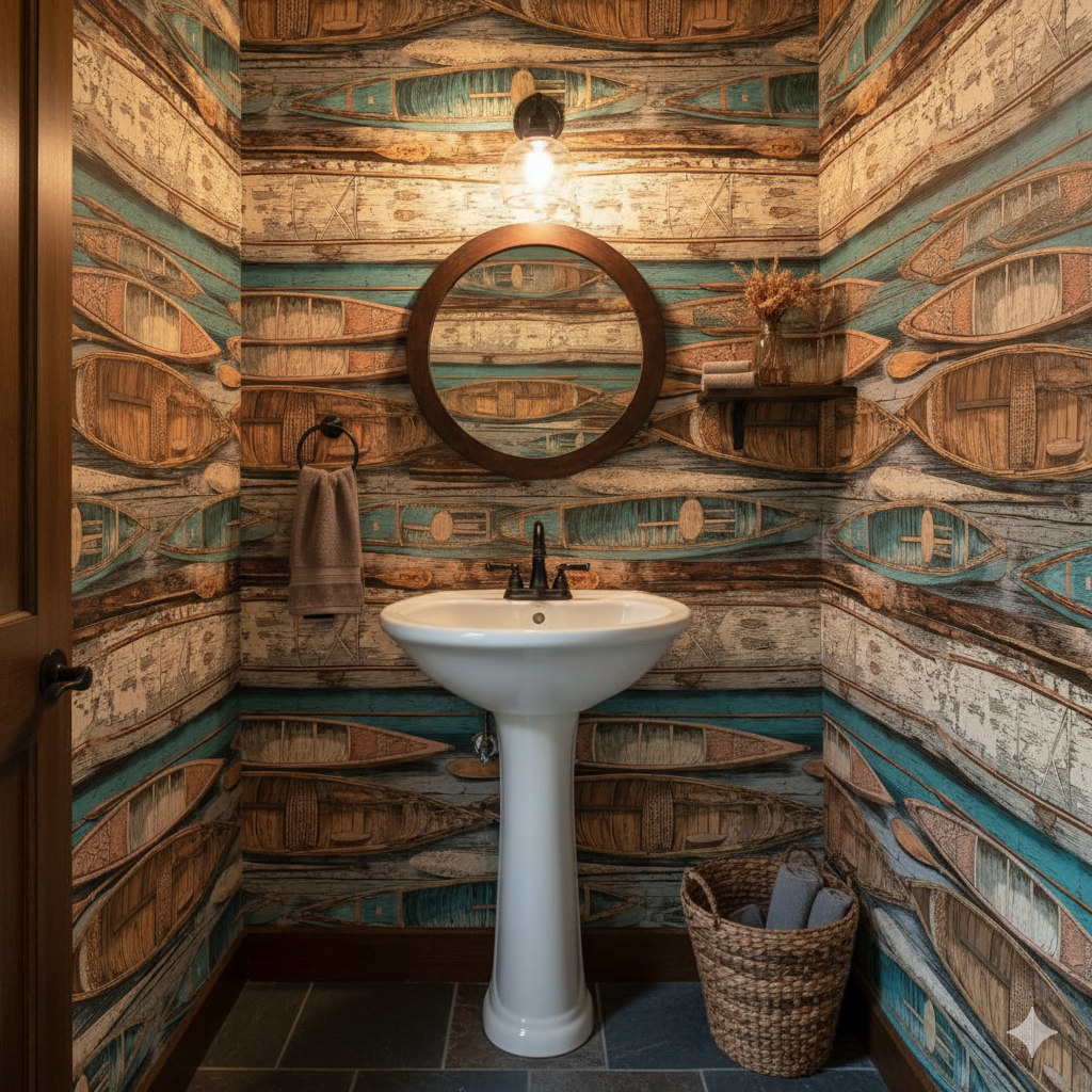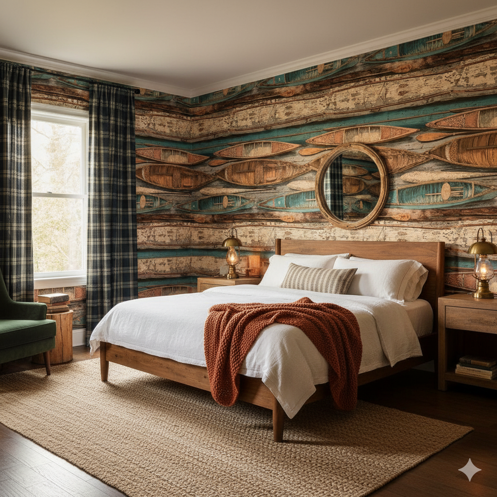 This intricate, woodcut-style pattern highlights an assortment of canoes and oars rendered in earthy browns, rustic reds, and weathered turquoise, as if resting along a dock or boathouse. The level of detail in the woven textures, woodgrain, and traditional craftsmanship creates a nostalgic, heritage-inspired atmosphere. Birchwater Canoes is ideal for lakeside cabins, vacation homes, or recreation spaces, where it celebrates the culture of paddling, craftsmanship, and outdoor adventure. It also functions well as an accent wall in lodges, restaurants, or retail spaces that want to evoke rugged Americana, heritage sports, or outdoor leisure.