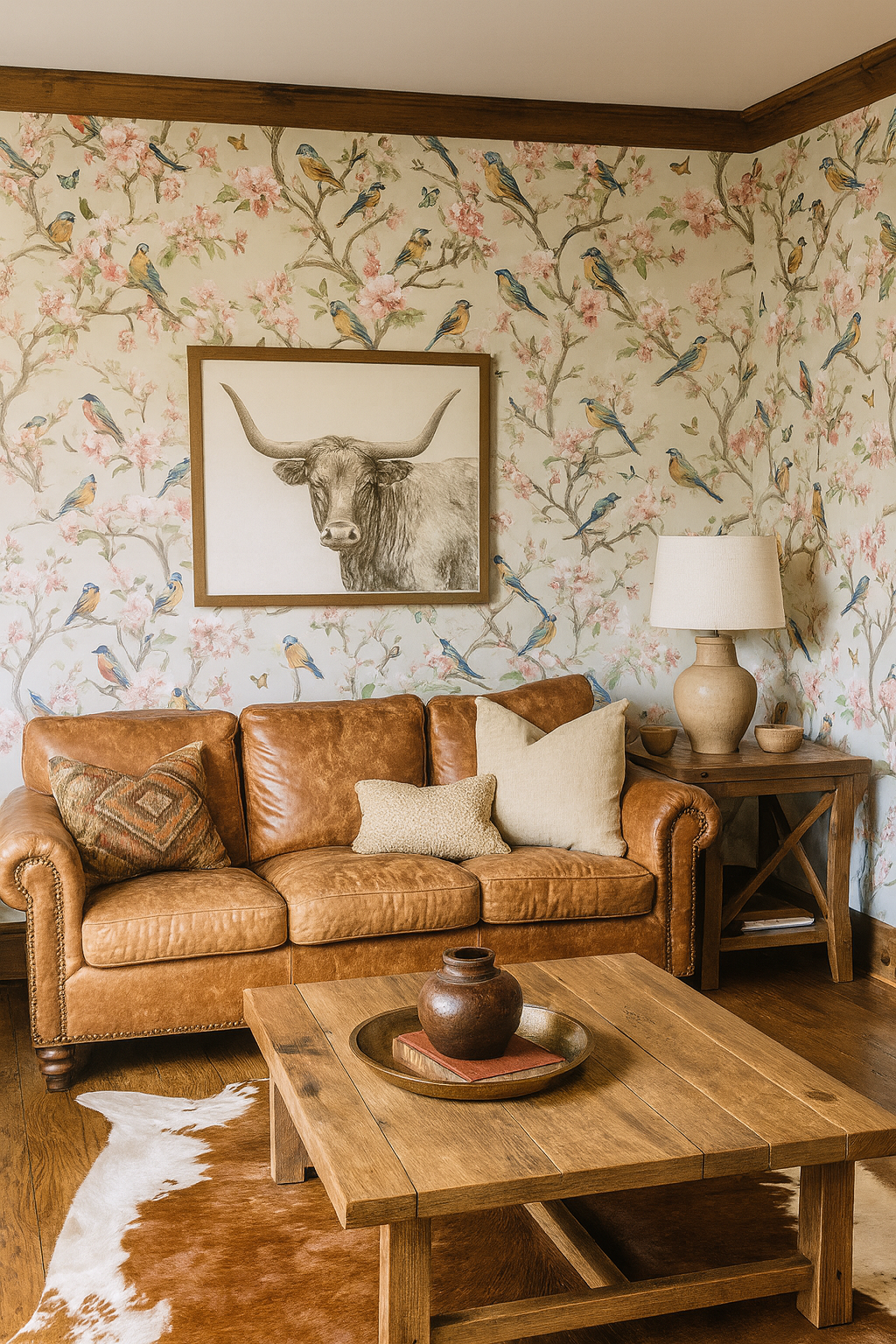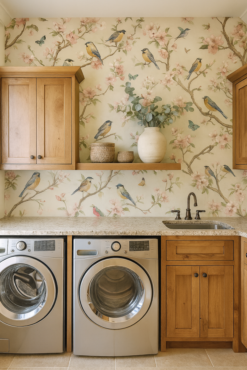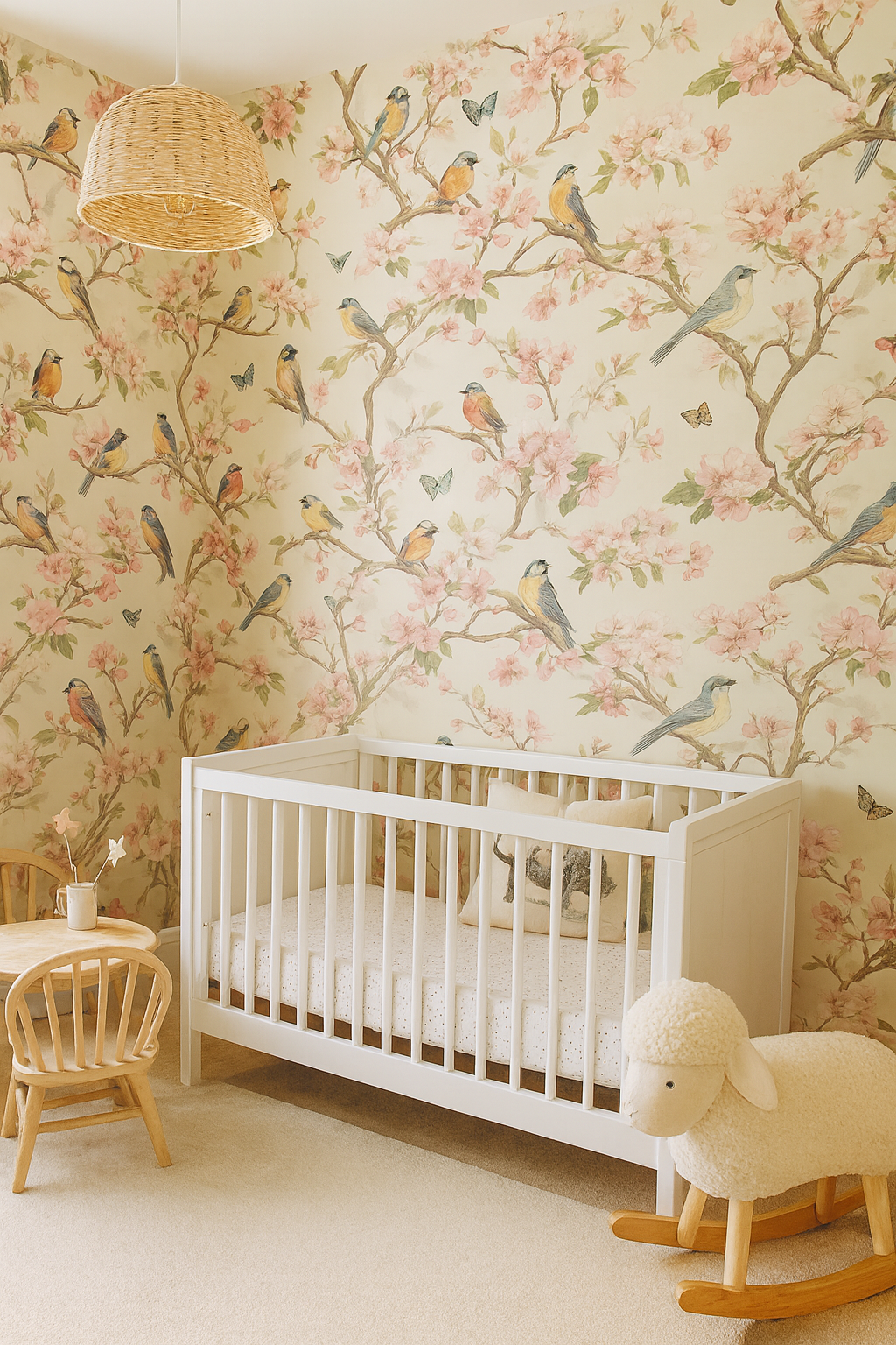 Delicate and serene, Birdsong Sonata features watercolor illustrations of chirping songbirds perched on flowering cherry blossom branches, accompanied by fluttering butterflies. The soft blush, sage, and sky-blue palette creates a soothing pastoral landscape ideal for nurseries, garden rooms, or any space in need of lighthearted spring freshness.