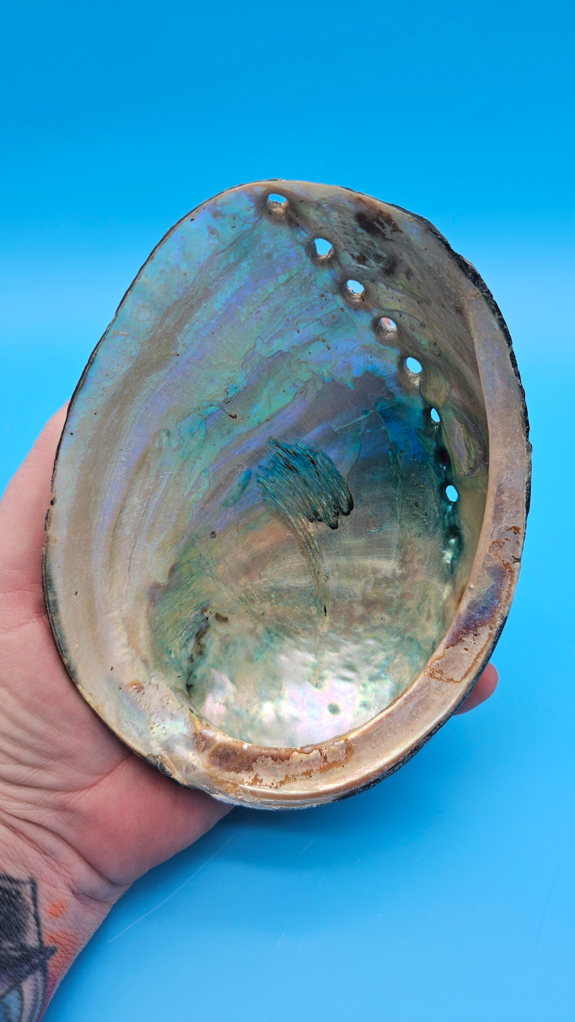 This Black Abalone Shell (Haliotis cracherodii) reveals deep ocean hues and a radiant nacre interior shimmering with blue, green, and silver tones. A striking coastal display piece with timeless marine character.