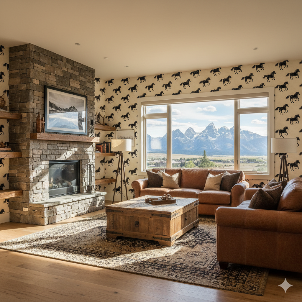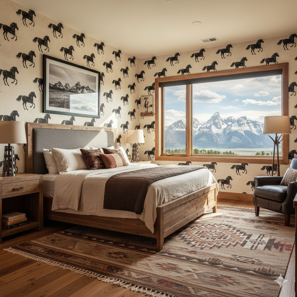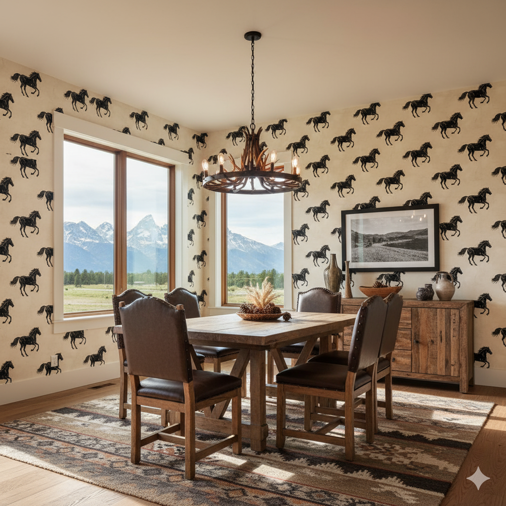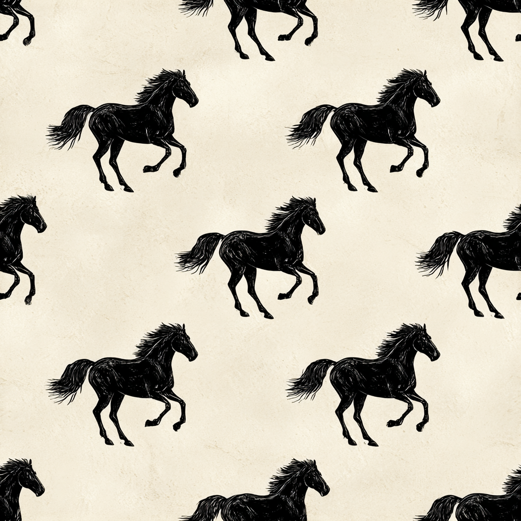 This pattern captures the untamed power of wild horses, illustrated in striking black silhouettes that gallop across a soft parchment ground. Each horse is drawn with energy and movement, manes whipping and tails flying, evoking the spirit of open plains and freedom. The design is bold yet balanced, making it perfect for a ranch-inspired living room, a boy’s bedroom with a love for equestrian themes, or even a modern rustic office. The contrast of dark forms on a neutral backdrop creates visual rhythm without overwhelming the eye, and it pairs beautifully with leather seating, reclaimed wood, or stone textures for a grounded, authentic look.