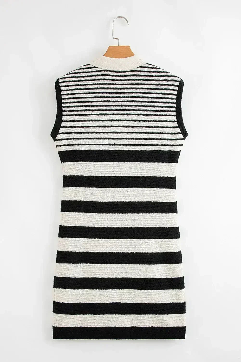 - This black sweater dress features a striking mixed striped print that adds a modern touch to the classic design.