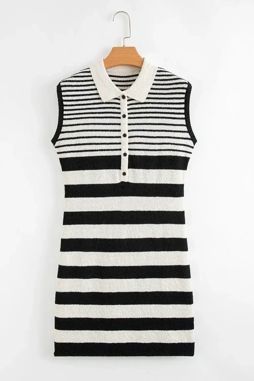 Black Mixed Striped Print Half Placket Collared Cap Sleeve Bodycon Sweater Dress