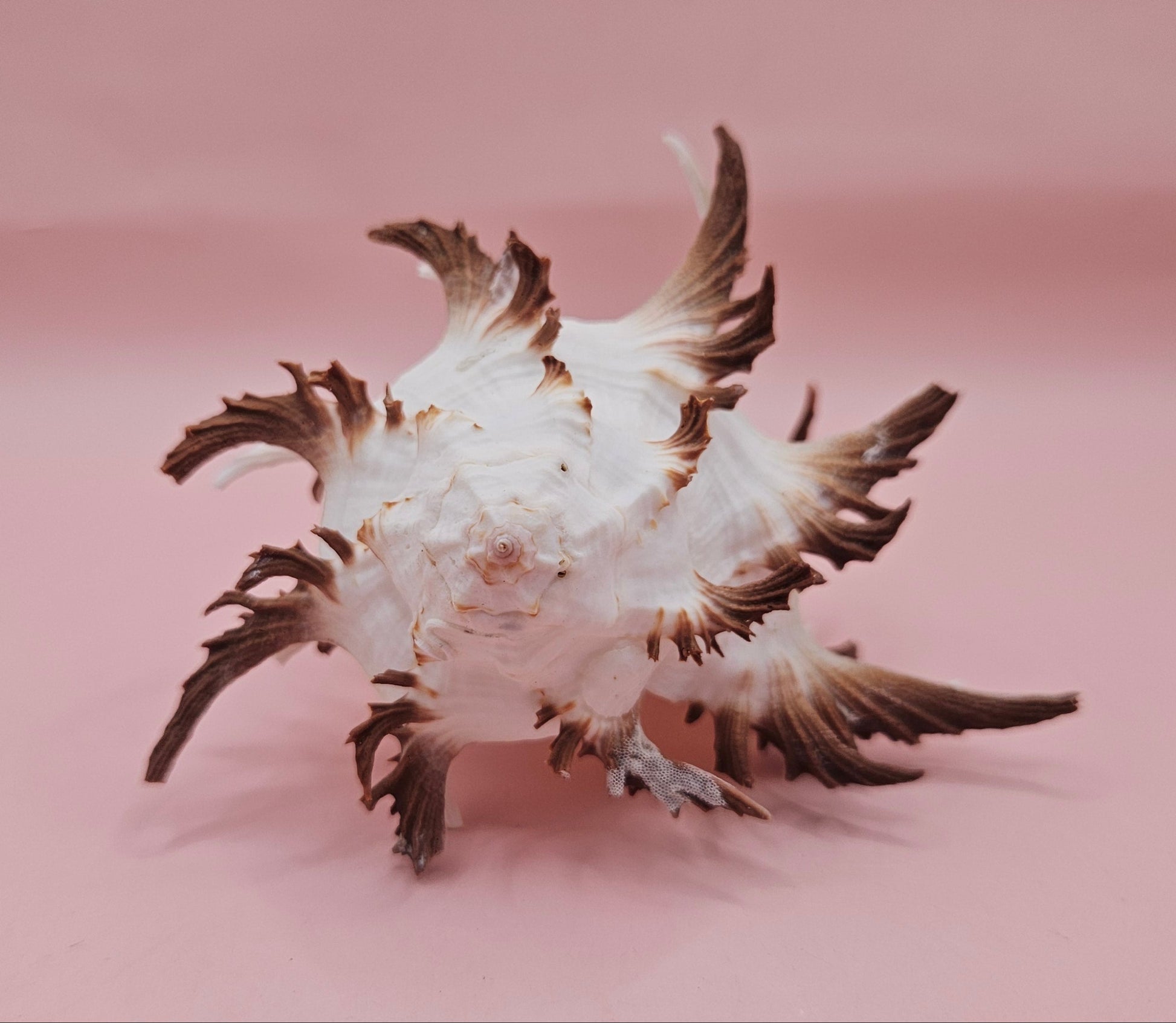 Add a dramatic edge to your coastal decor with this striking black murex shell. With its long, twisted spines and deep contrast between white and dark brown, this shell adds bold texture and organic interest to any shelf or table display. A natural conversation piece for those who love the ocean’s wilder side.