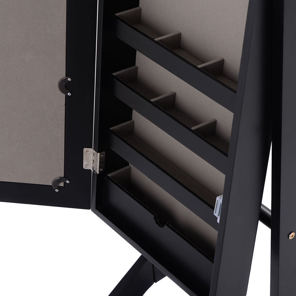 Black Wood Jewelry Storage Cabinet Freestanding Floor Mirror Brand new and high quality with better painted Solid MDF body and elegant mirror Large storage capacity Dressing mirror and jewelry cabinet cleverly combines Convenient and practical Color: Black Frame material: MDF Mirror material: Glass