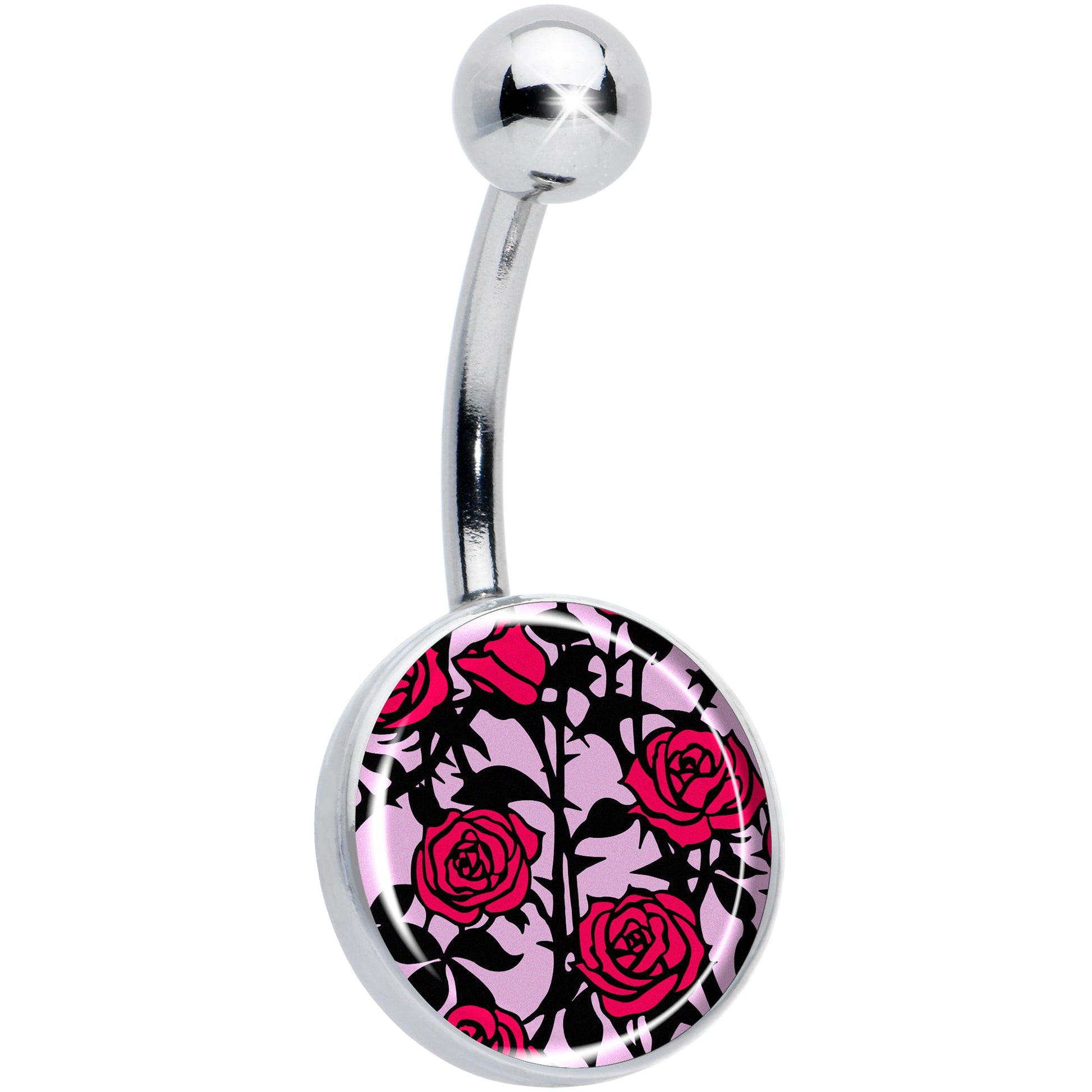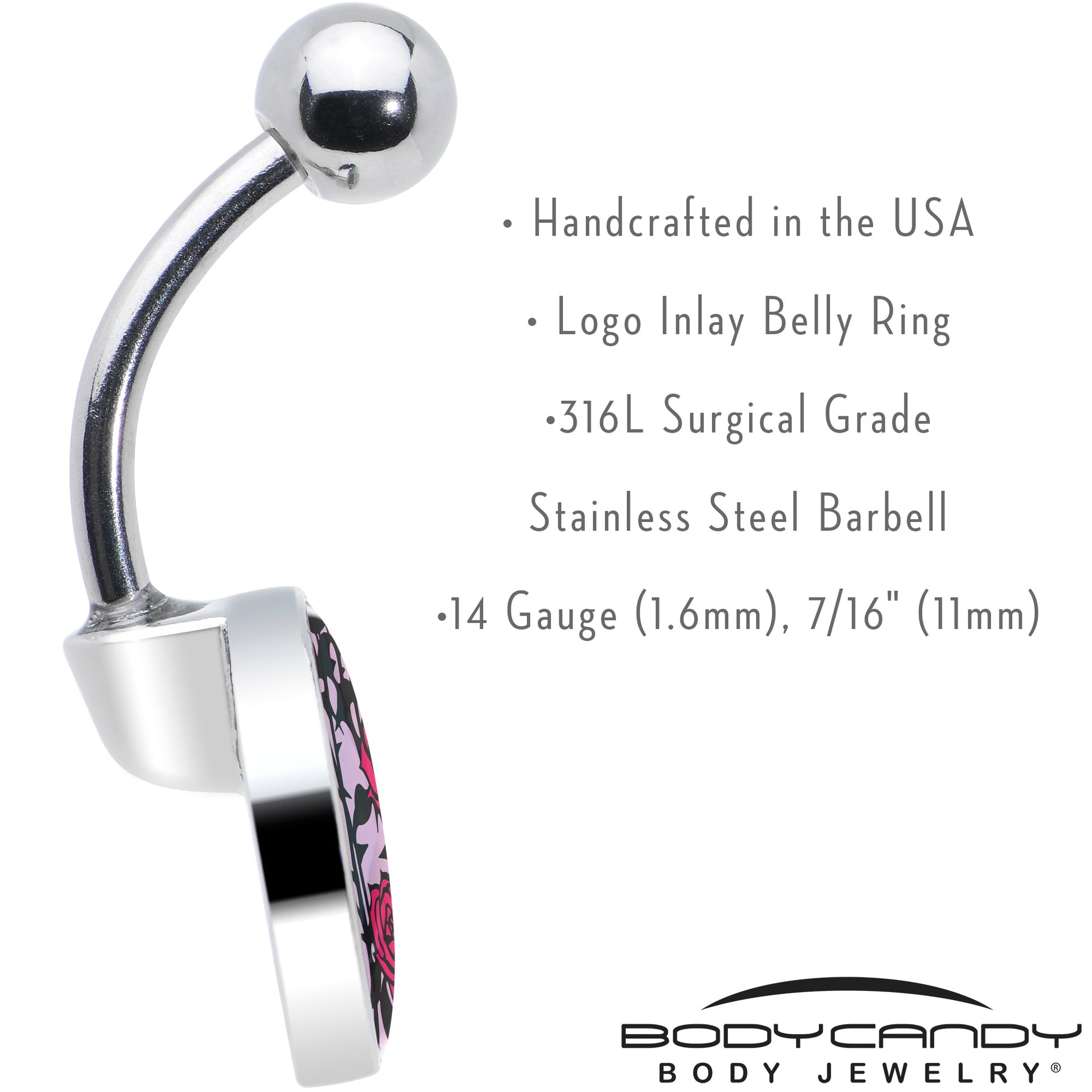 This 14 gauge artist hand drawn flower belly ring jewelry is part of our new line of Blossom Creations body piercing jewelry for the season. This 7/16 inch navel ring is made with a 316L surgical grade stainless steel curved barbell with a 5mm top ball end. The bottom end features a logo inlay charm with roses growing up the charm, letting their red petals and green leaves and stems contrast beautifully against the background. Get ready for roses with this richly romantic rose garden belly piercing jewelry.