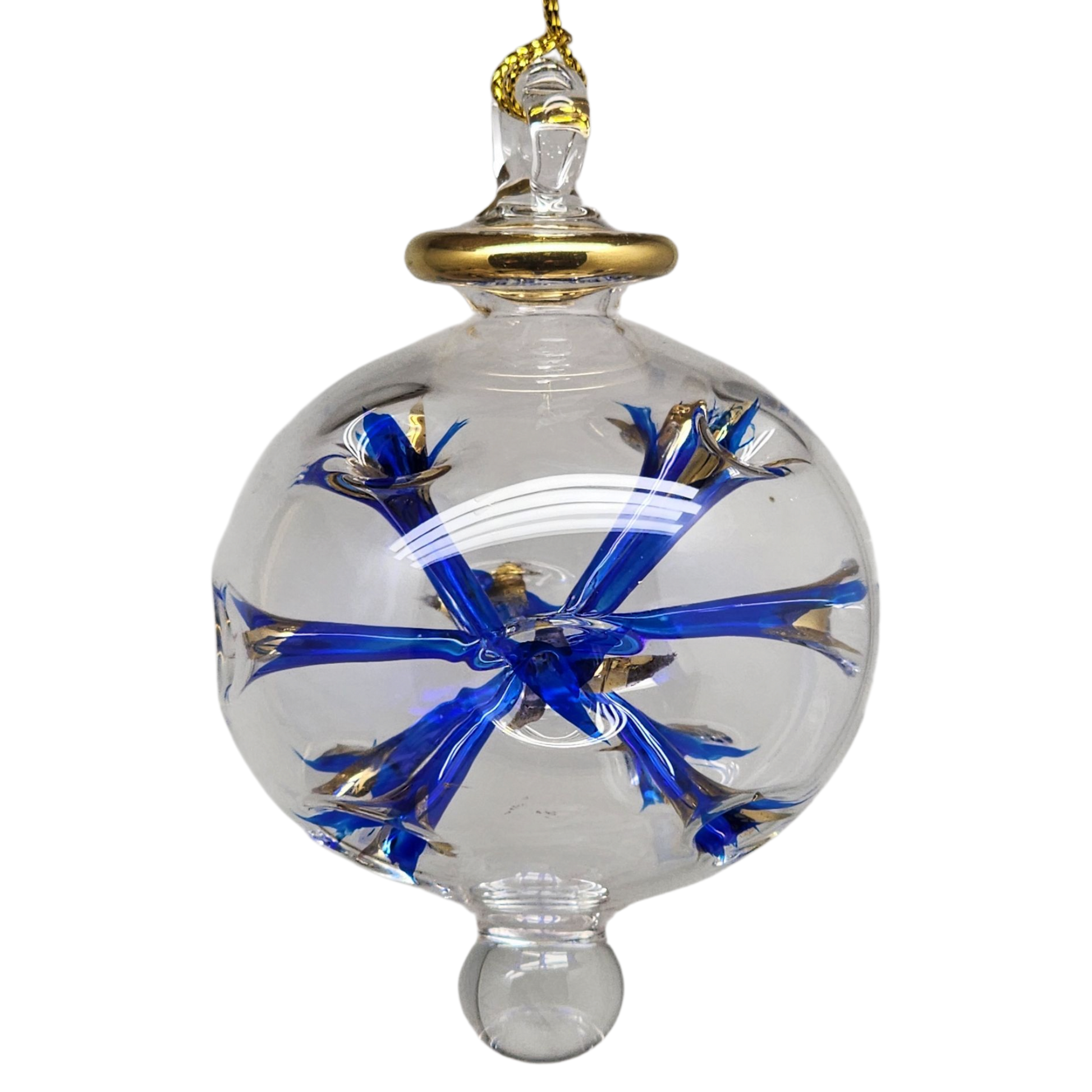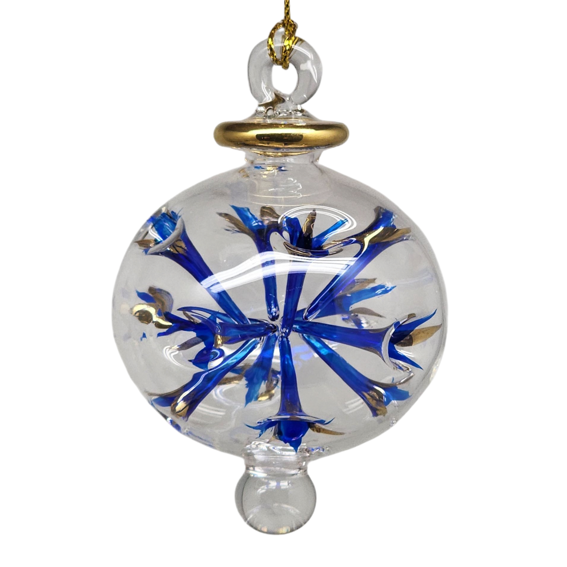 This mesmerizing globe ornament captures the magic of a midnight sky lit by distant stars. Mouthblown from German Pyrex glass in Egypt, its crystal-clear sphere holds an internal burst of cobalt-blue flared petals, each tipped with shimmering 24K gold accents. Hand-painted and oven-baked to lock in its radiant hues, the piece balances a sense of delicate fragility with unexpected depth—like a handful of stardust frozen in time. A clear glass finial and loop complete the design, creating a graceful silhouette that dances with the glow of nearby lights.