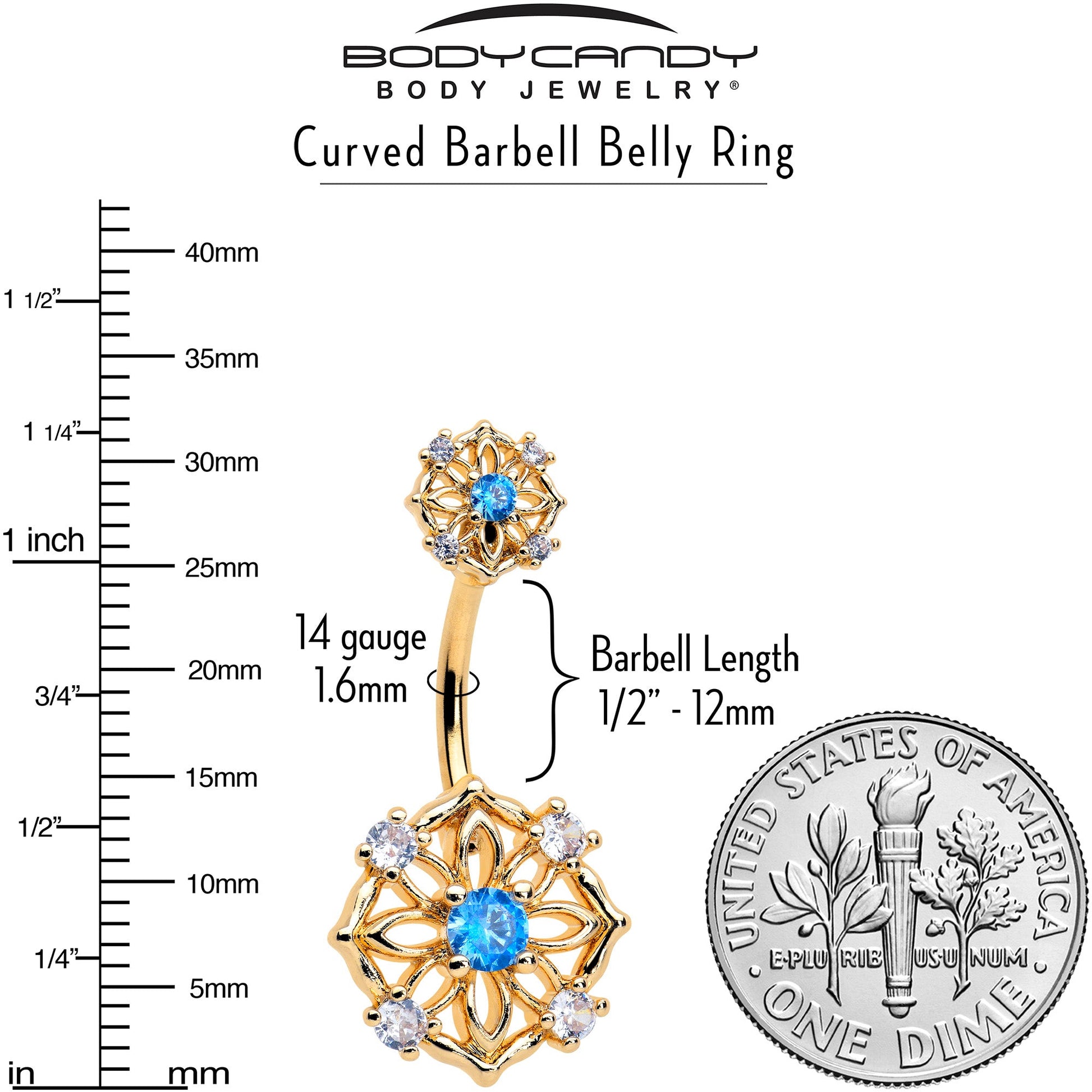Your style will be blooming with this 14 gauge navel ring. It's made with a 3/8 inch gold tone PVD over 316L surgical grade stainless steel curved barbell. Each of the ends features a circular flower charm with openwork petals. The flowers are set with blue cubic zirconia gem centers and clear cubic zirconia gems along the outer edges. Let your look blossom with this fabulous floral belly piercing jewelry.Specifications