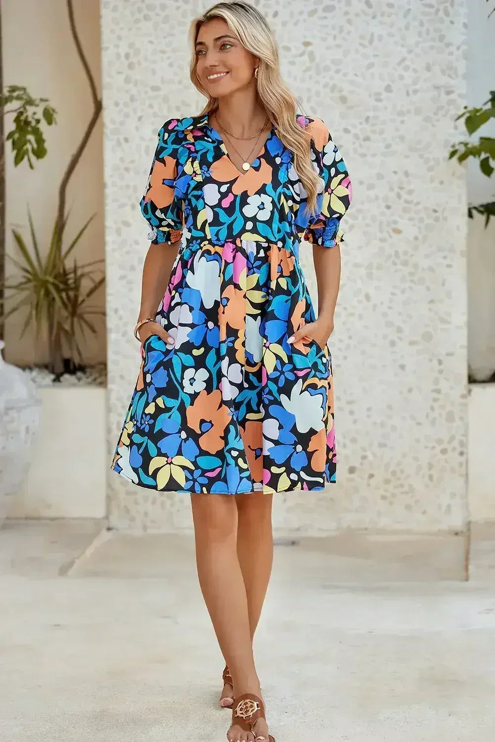 - The mini dress features a vibrant floral print that adds a touch of femininity and elegance to your outfit.