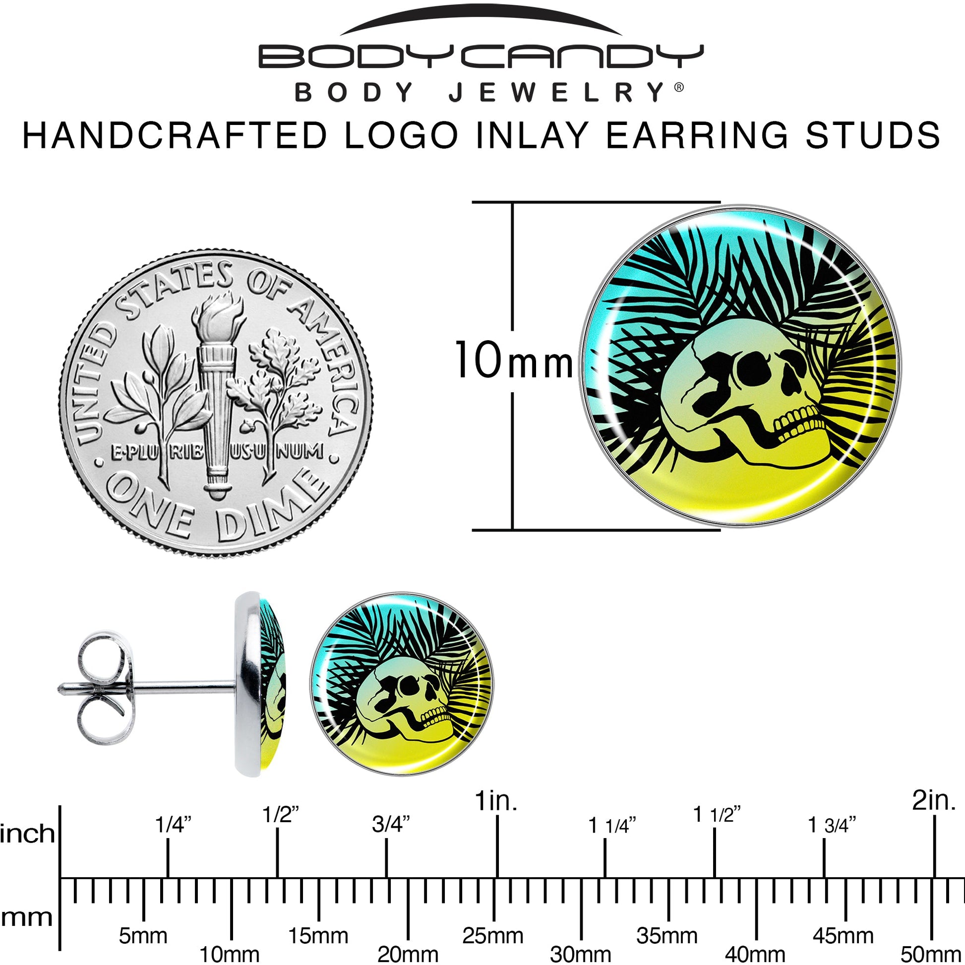 Add some palmy desert style to your look with a creepy twist when you're rocking these stud earrings for pierced lobes. They're made with stainless steel straight posts with friction backs for a secure fit. Each one features a logo disc charm of a silhouetted desert with a blue sky, yellow sand, and silhouetted palm fronds. At the center is a simple skull, adding a touch of eerie style to an otherwise peaceful scene. Let your look rest in peace with these pierced earrings. Sold as a set of two.