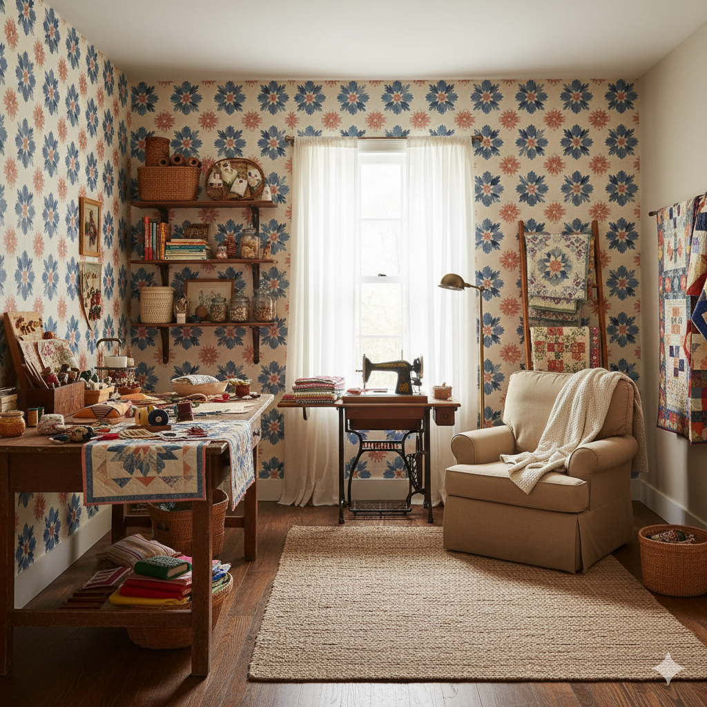 Evoking the charm of handcrafted patchwork, this wallpaper features repeating quilt-inspired star motifs in dusty shades of denim blue and terracotta rose. The softened watercolor effect gives the pattern a vintage, timeworn appeal, as if it were stitched from fabric faded by desert sun. Perfect for farmhouse kitchens, rustic cabins, or Southwestern-inspired bedrooms, this design adds comfort and nostalgia. It pairs beautifully with reclaimed wood, stone fireplaces, or warm neutral linens, making spaces feel both cozy and storied.