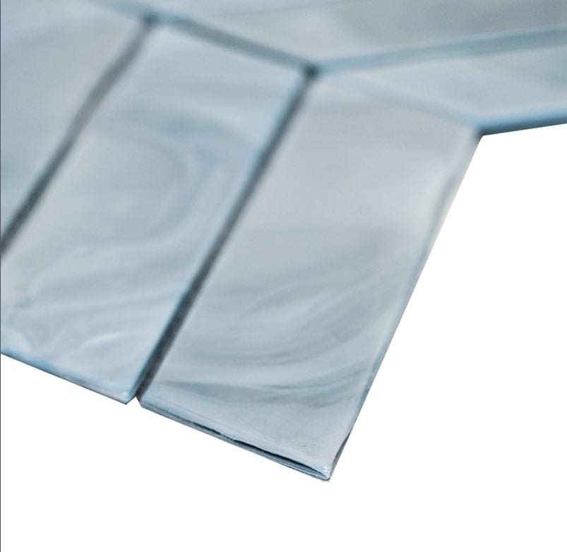 The Blue Shimmer Chevron Pattern Tile marries artistic style with versatility in this gorgeous blue tone mosaic backsplash tile. The mesh backing makes it simple to install and keeps everything lined up perfectly for that flawless look in your kitchen or bathroom. This glass tile can be used in both residential and commercial spaces on walls and countertops for a beautiful statement piece that will draw attention and give your space more interest.
