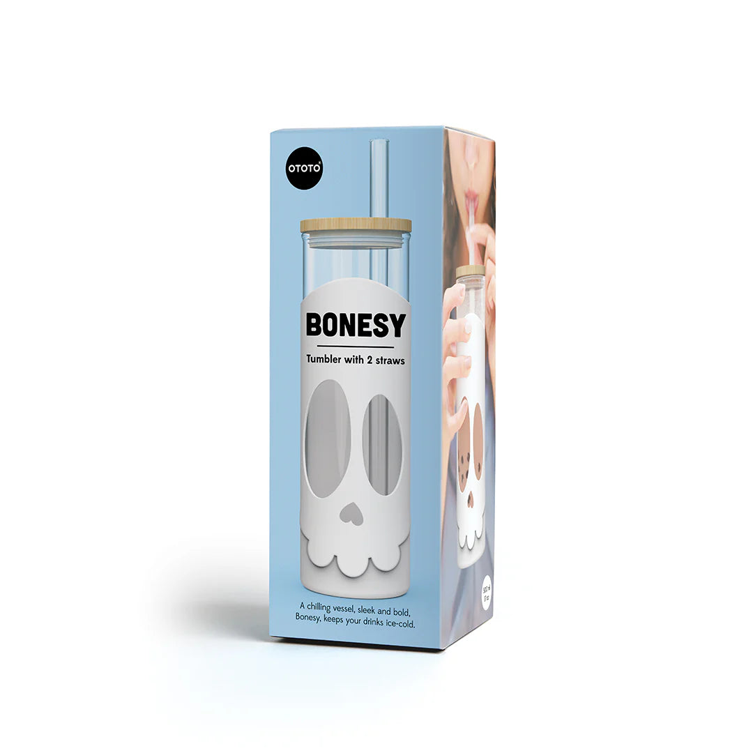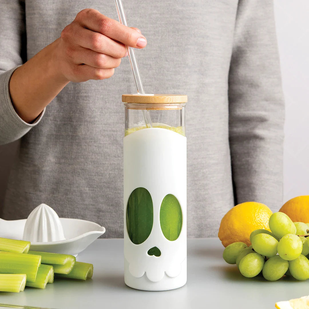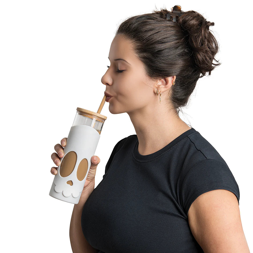 Meet Bonesy, the glass water bottle skeleton crew for your iced brews!