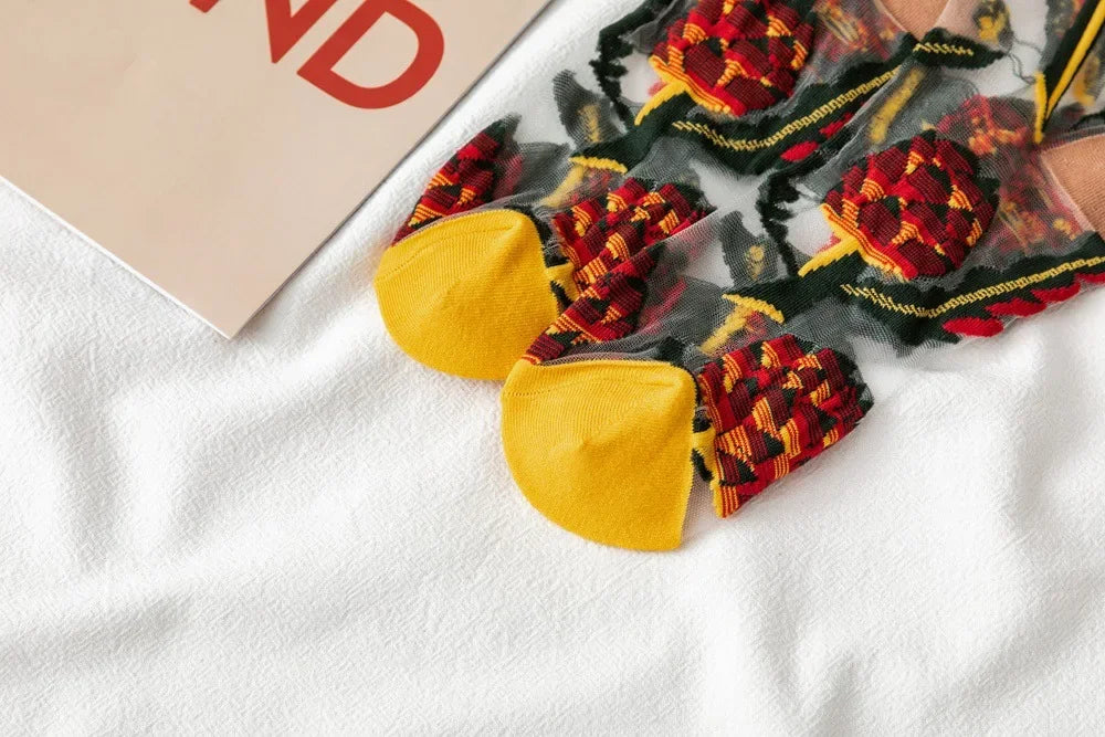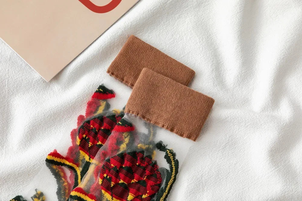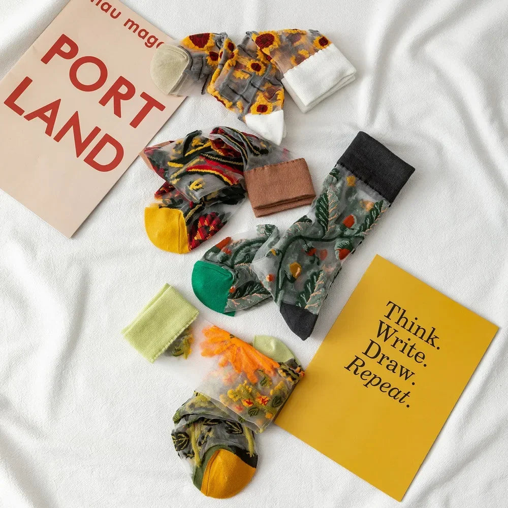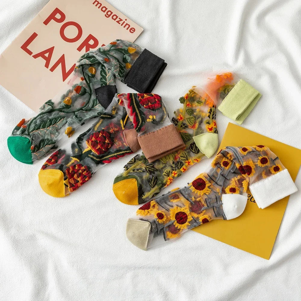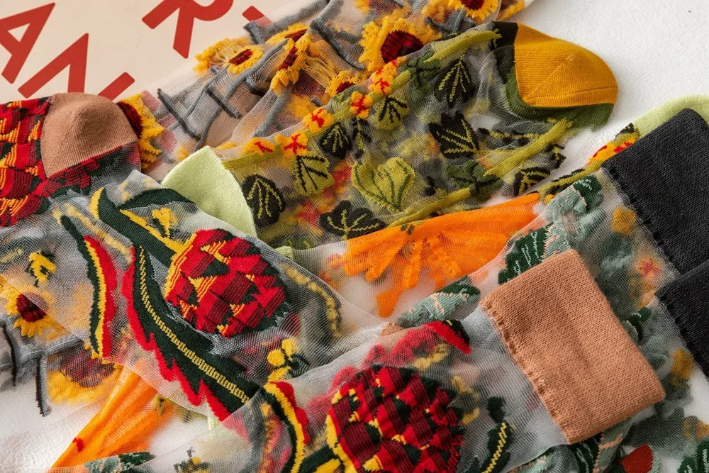 These sheer, crystal silk-inspired stunners are embroidered with wild florals, tropical vines, birds, and sunbursts that wrap around your legs like wearable art. They're soft, ultra-breathable, and made to stand out, because your socks should be as unapologetically gorgeous as you are.