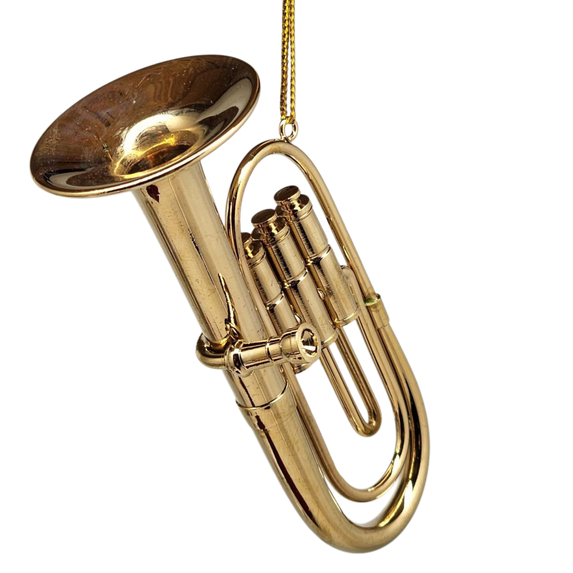 Celebrate the magic of the holidays with this charming brass euphonium ornament, a perfect gift for music lovers and band enthusiasts! This tiny, beautifully crafted euphonium captures the elegance of the real instrument with its shiny gold finish and detailed valves. Suspended from a gold string, this ornament adds a touch of musical cheer to any Christmas tree or festive display. Its compact size makes it a standout piece among traditional holiday decorations, bringing a unique melody to your seasonal décor.
