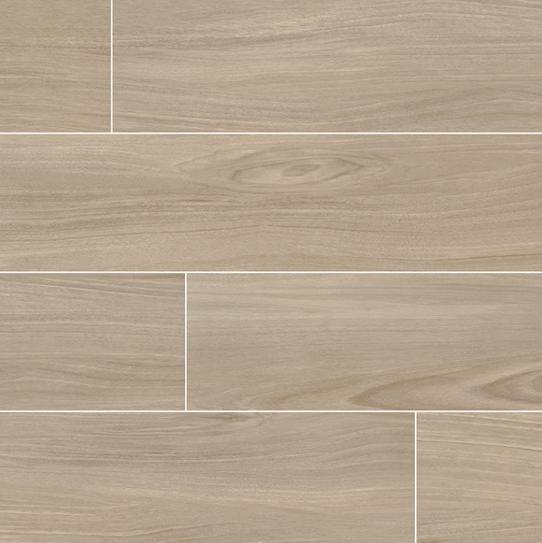 Saddle Porcelain Wood Tile from the Braxton Collection features long linear veins in creamy white to tan hues set against a neutral background for an affordable luxury look. These 10x40” large format wood look planks create a soothing and relaxing mood, with minimal grout lines for seamless continuity. Use on floors, walls, or both and create a signature space that welcomes a wide variety of decorative schemes. Whether installed in a traditional pattern or eye-catching herringbone, these easy-maintenance, high-durability rectified tiles are perfect for busy homes and commercial spaces—indoors and outdoors.