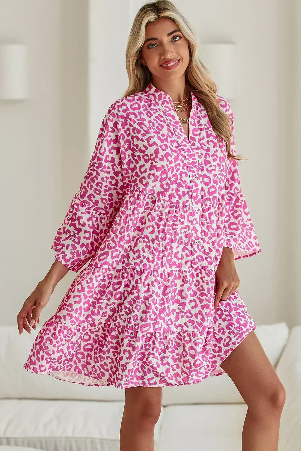 Bright Pink Leopard Print Flounce Sleeve Mini Dress