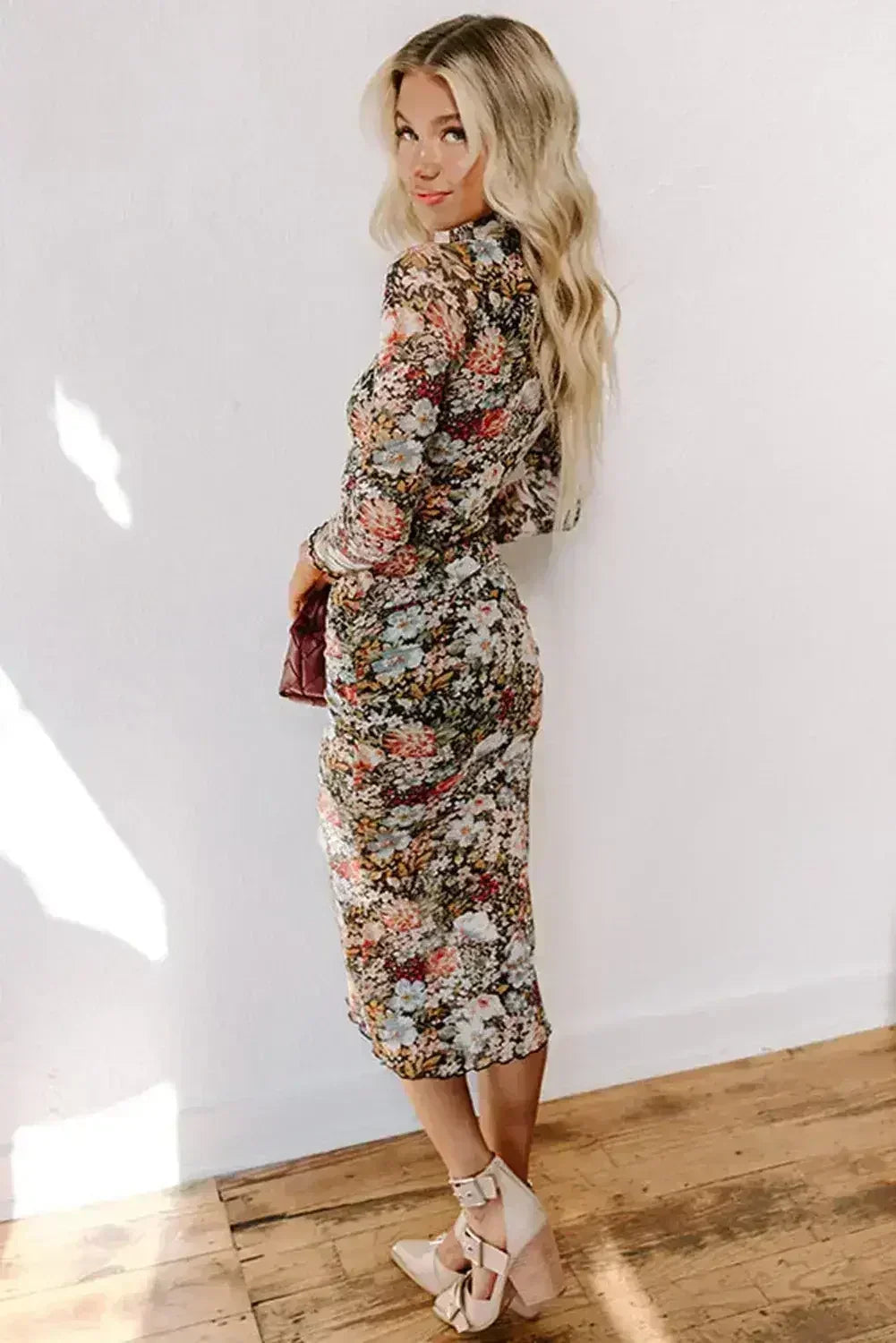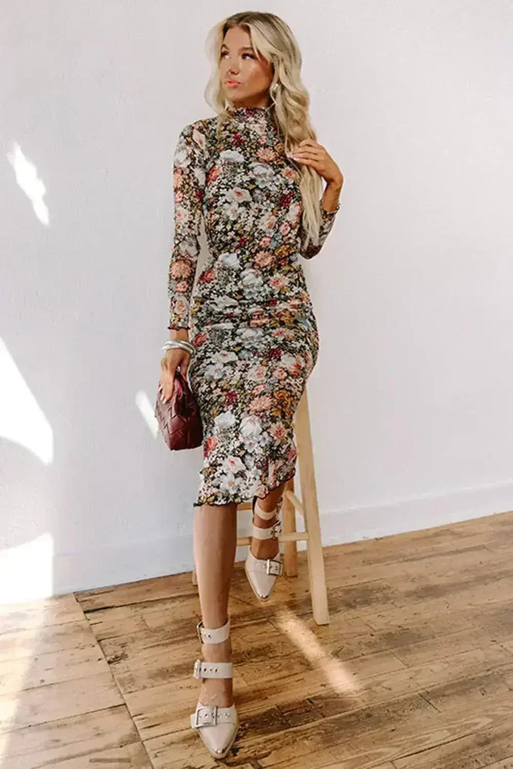 Brown Floral Allover Print Mock Neck Bodycon Midi Dress
