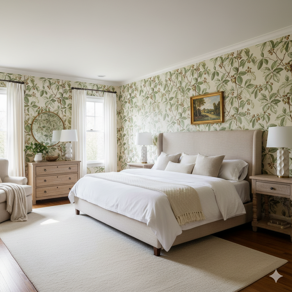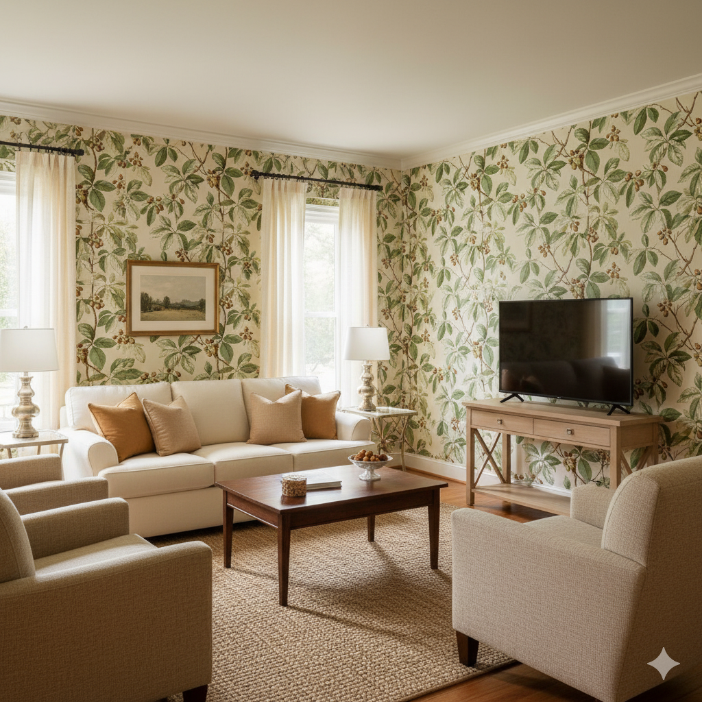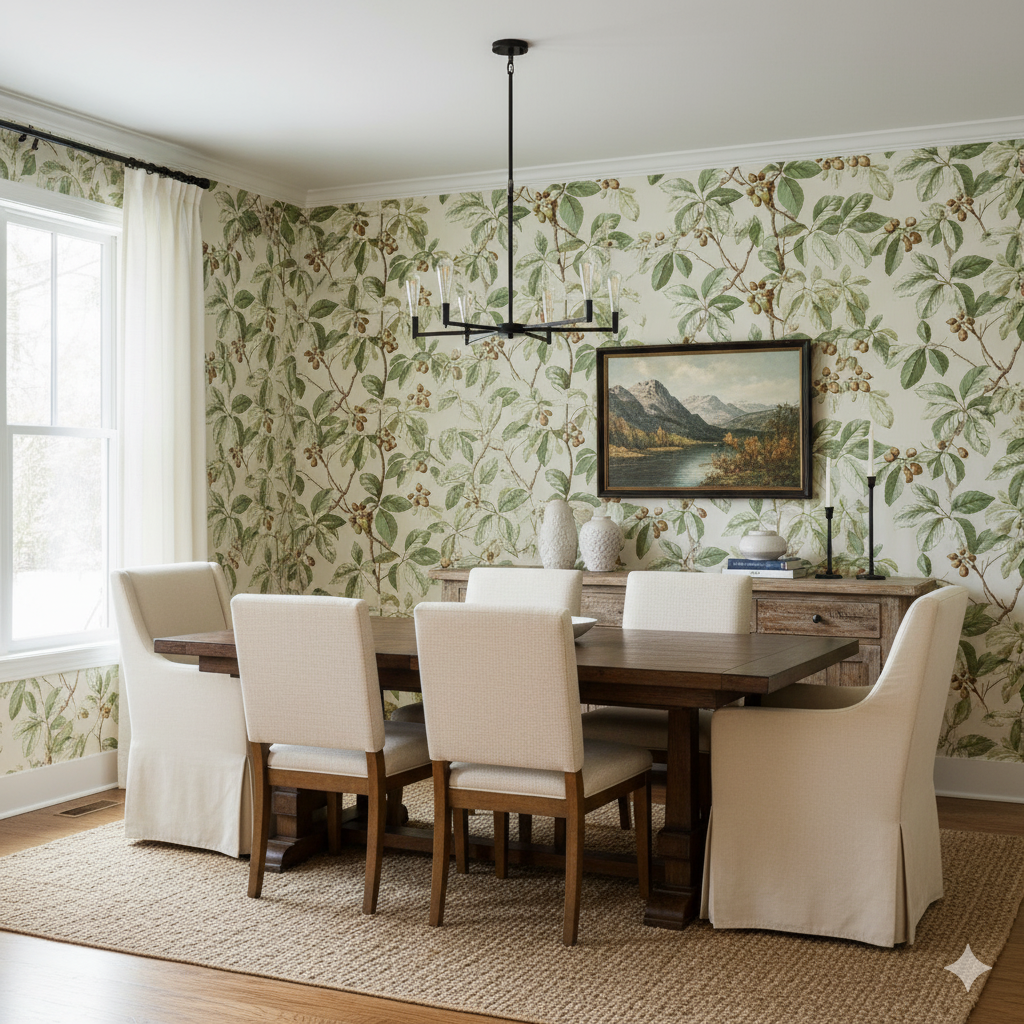 Branches of the Ohio buckeye tree stretch across the design, with their iconic five-lobed leaves painted in varied shades of green, from mint to deep forest. Clusters of nut pods hang naturally from the branches, their golden-brown shells adding visual texture against a cream base. The botanical rendering feels timeless, evoking antique illustrations but with a softer, more approachable palette. This wallpaper suits traditional libraries, heritage-style dining rooms, and cozy reading corners, where it can lend a scholarly charm. It also pairs well with vintage leather furnishings, heirloom wood pieces, and accents of brass.