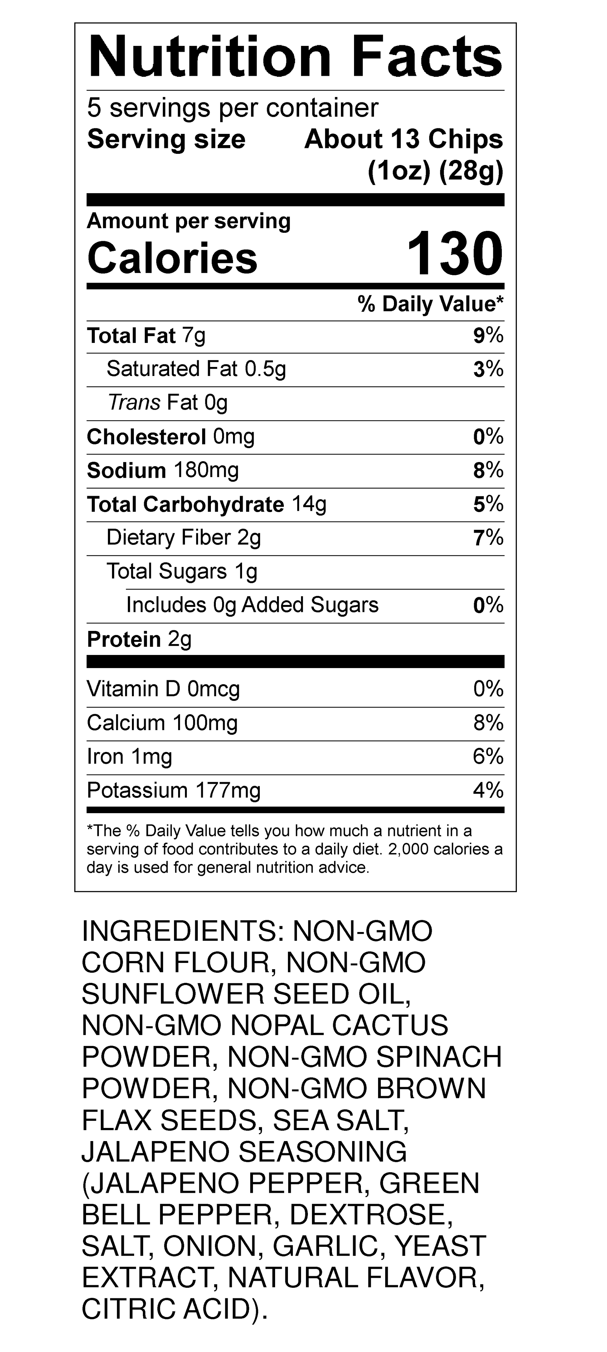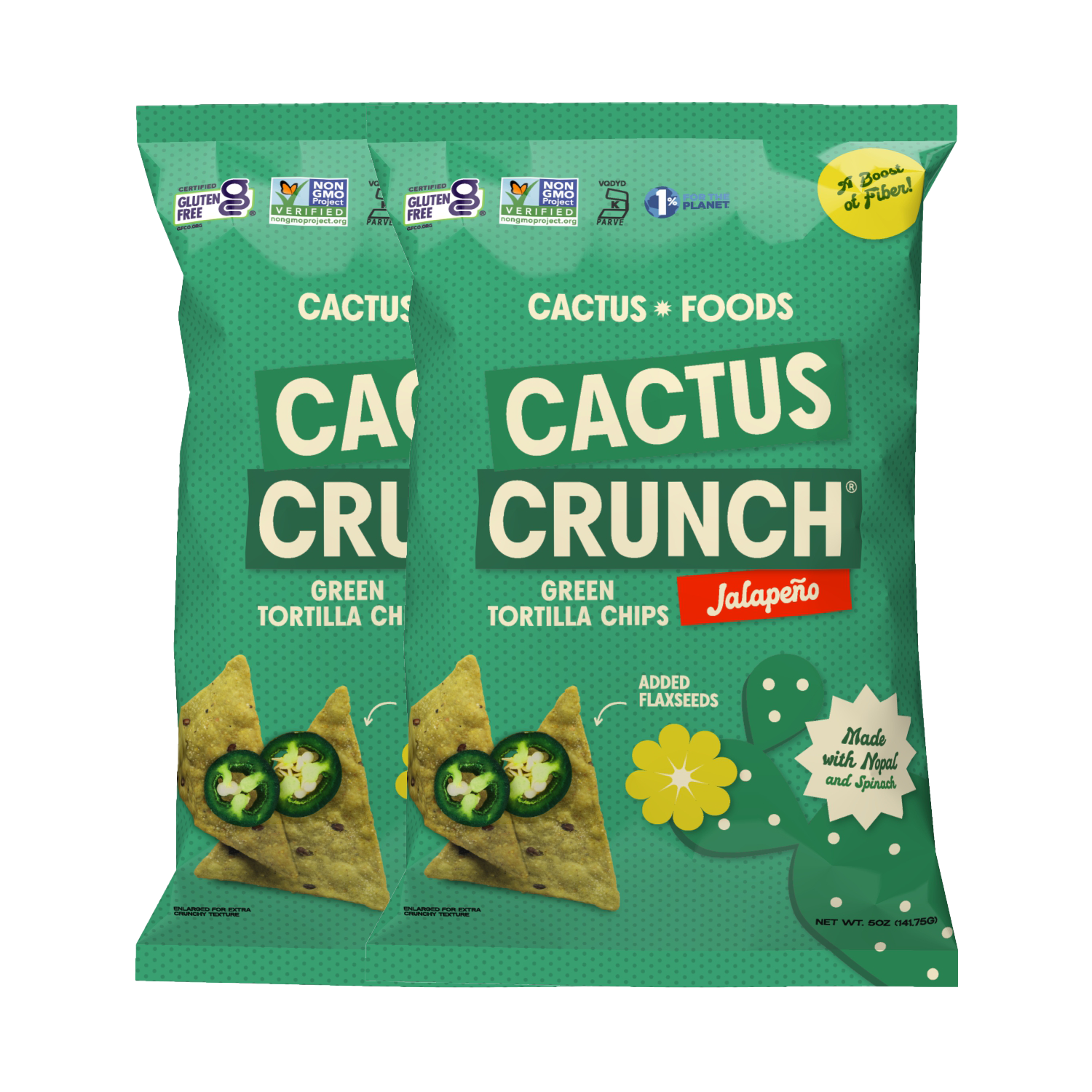 Jalapeño: Spice up your snack time with our Jalapeño Cactus Crunch Chips. Infused with the bold, zesty flavor of jalapeño seasoning, these chips provide a tantalizing heat that builds with every bite. Made from the same natural ingredients as our Sea Salt flavor, including nopal flour, corn, spinach, and flaxseed, they offer a unique crunch and are ideal for those who love a little kick in their snacks.