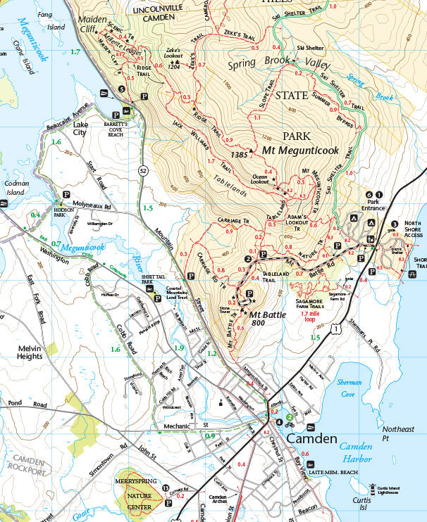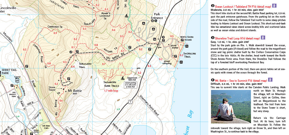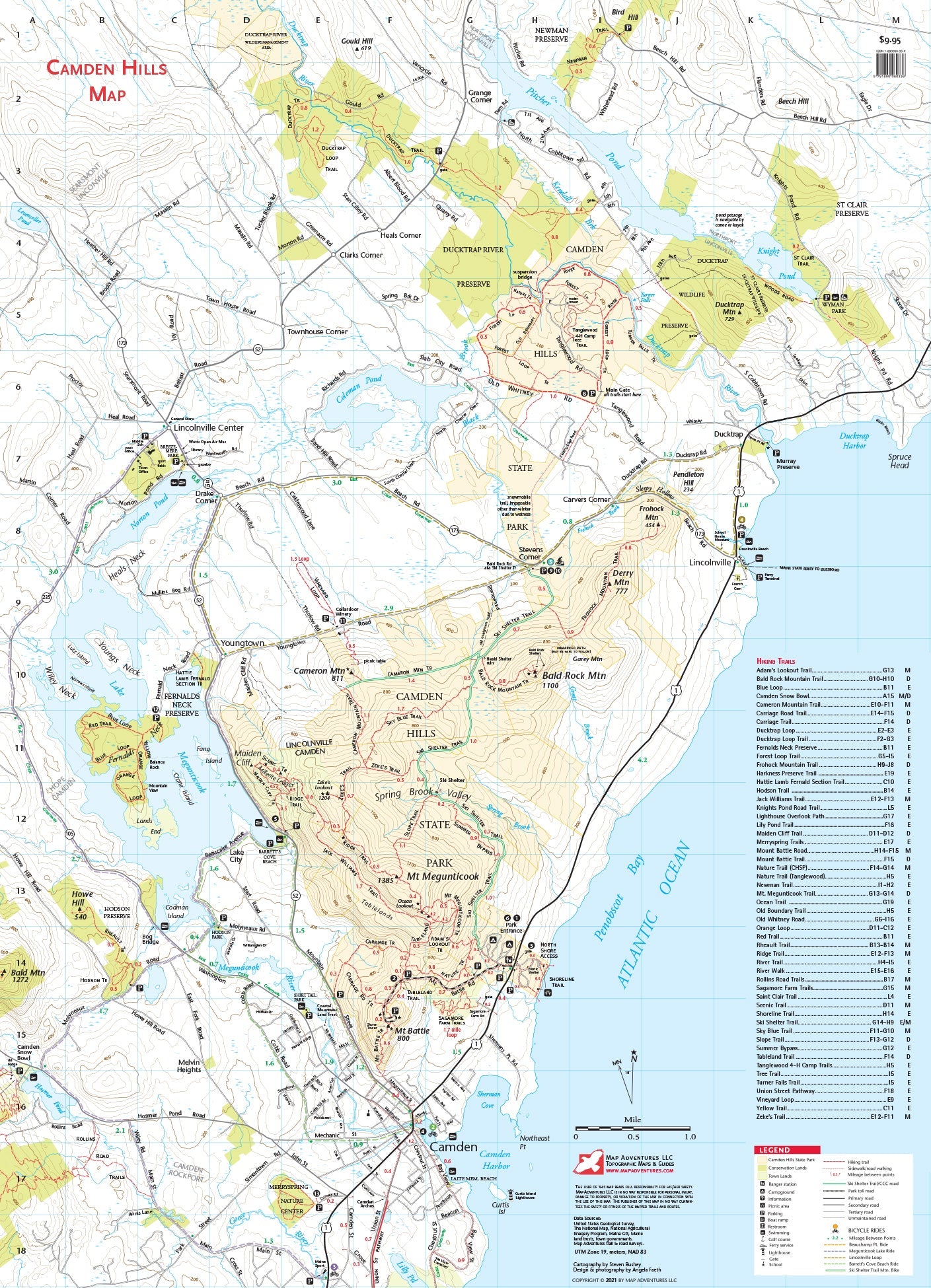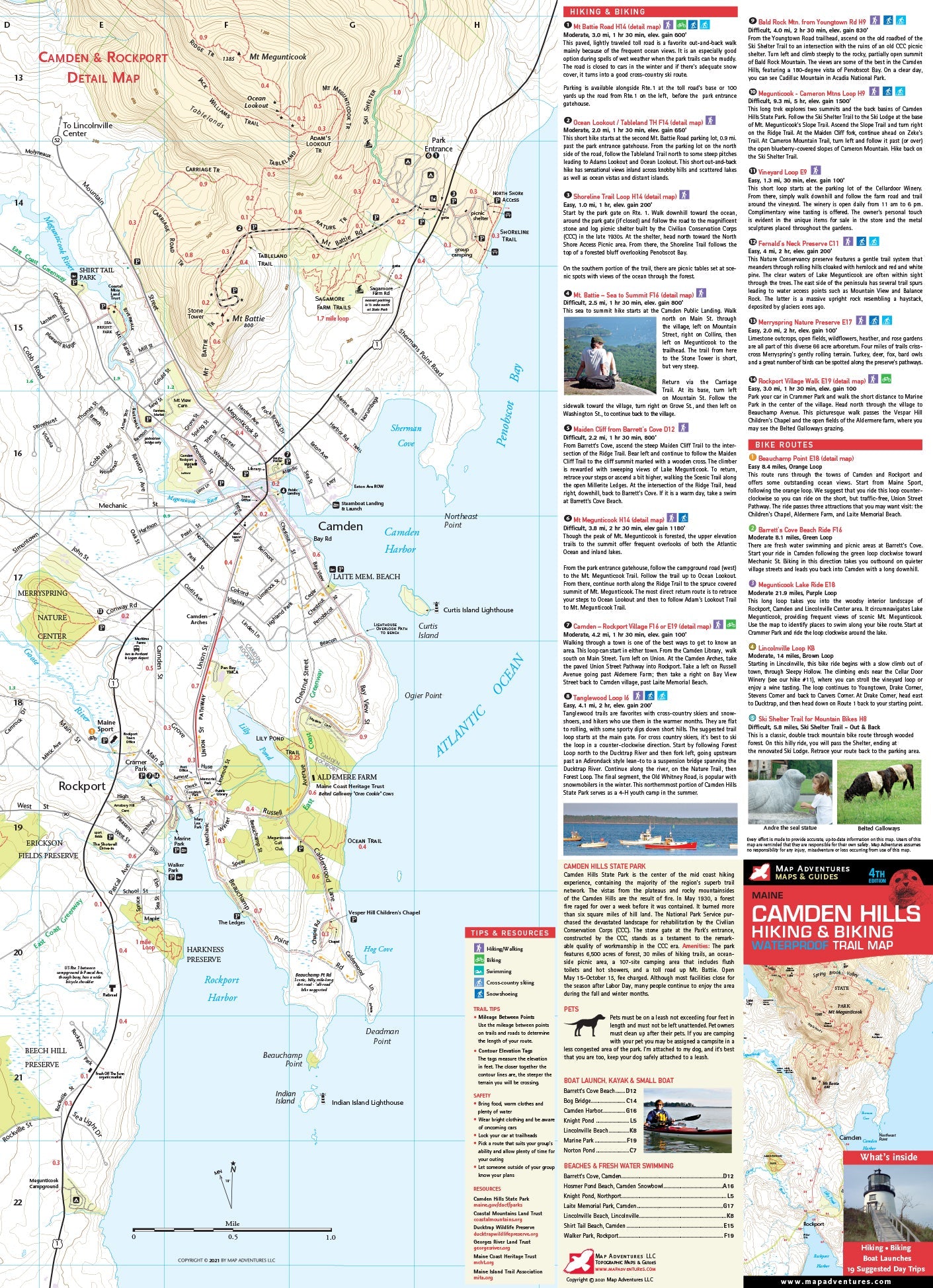 One of Maine’s best kept secret hiking trails with ocean views just 3.5 hours from Boston! Camden Hills' miles of coastal hiking trails should not be missed. Camden State Park trails and sunset from Mt. Battie, with its postcard view overlooking the town of Camden, complement the seaside fun of kayaking, sailing, and a lobster feast. This is the companion map to Rockland Hiking & Biking, you will want both!