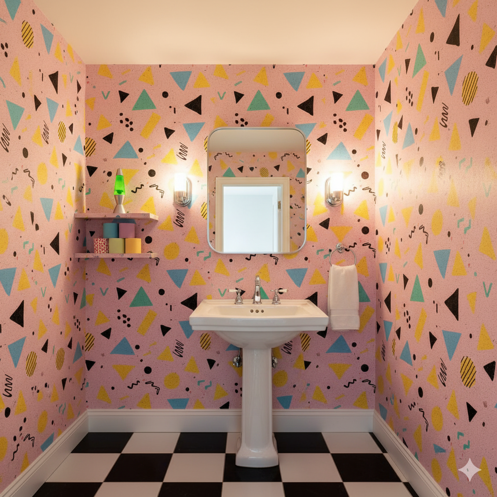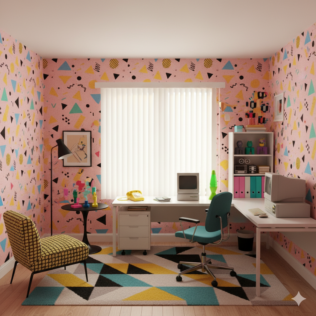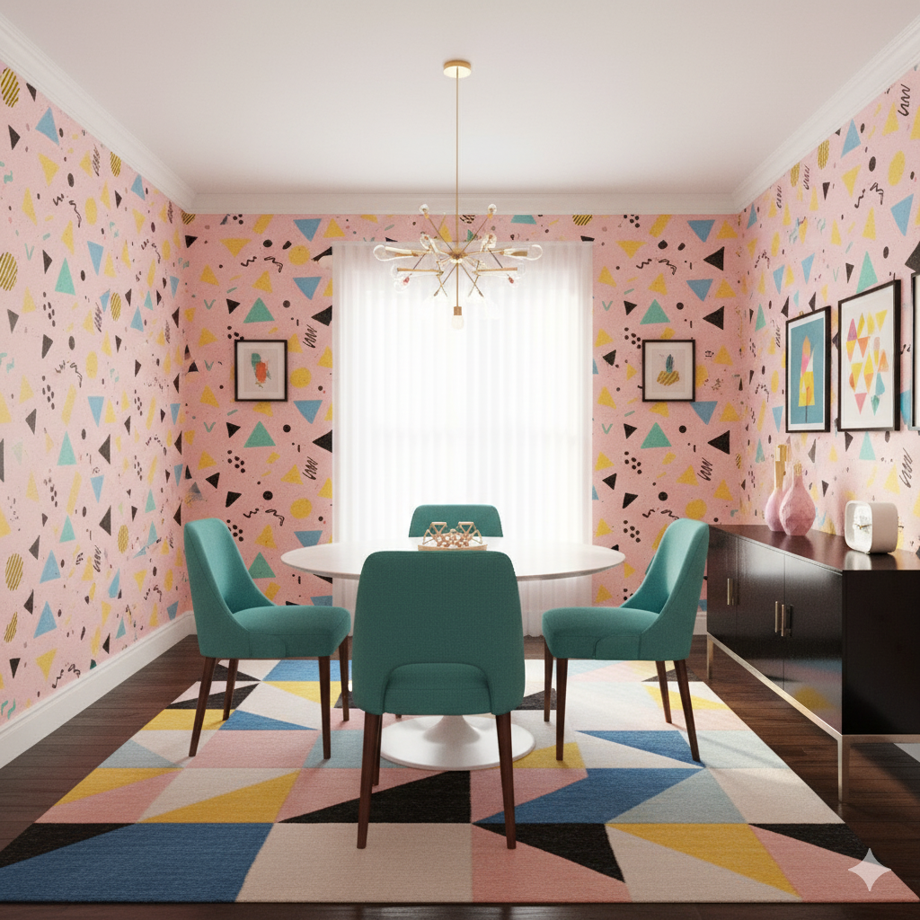 Bold, graphic geometry splashes across a soft pink backdrop in the form of triangles, circles, and squiggles in yellow, teal, and black. Its playful randomness captures the spirit of 1980s Memphis design, a style that embraced maximalism, color, and experimentation. The speckled ground enhances the retro arcade feel, conjuring images of roller rinks, soda shops, or bright playrooms of the era. Perfect for children’s bedrooms, creative studios, or retro cafés, it pairs especially well with lacquered furniture, neon signage, or bold plastic accessories.