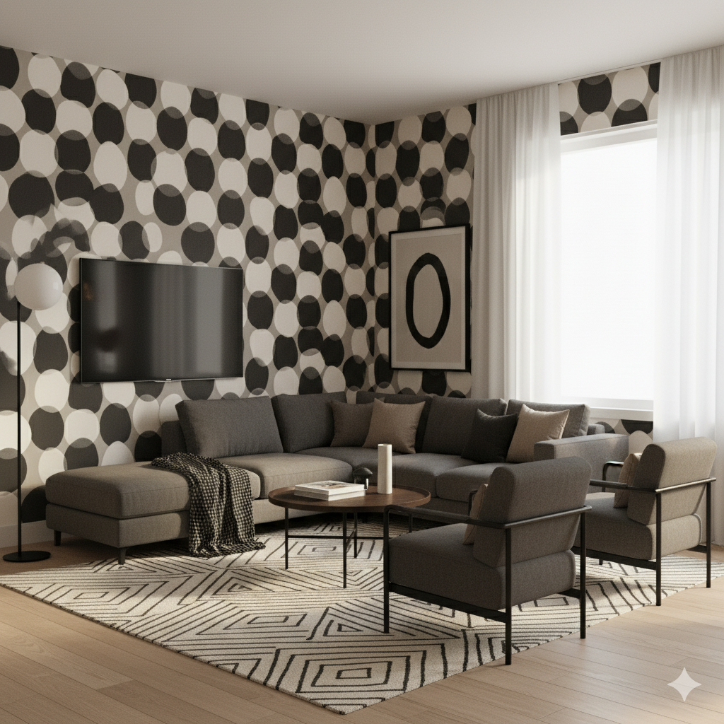 Oversized black and cream circles overlap across a taupe ground, creating a bold yet earthy polka-dot effect reminiscent of cowhide patterns reimagined through a modernist lens. The simplicity of the geometry makes it versatile for eclectic interiors, while the color palette anchors it firmly in Western ranch aesthetics. Ideal for playful powder rooms, kids’ spaces, or even an art-forward living room. It balances rustic inspiration with contemporary edge.