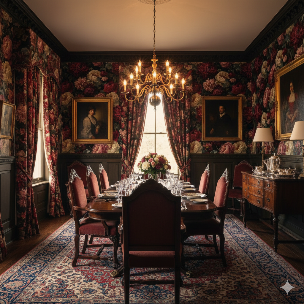 A lush, oil-painterly floral filled with deep crimson, blush pink, and cream blossoms layered against shadowed foliage. Every petal seems textured with brushstrokes, creating movement and a sense of living bloom. The palette is rich and dramatic, making it perfect for statement walls in bedrooms or dining areas where you want atmosphere and intimacy. It has an old-world romance but feels bold enough for modern eclectic interiors, especially when paired with velvet upholstery or brass accents.