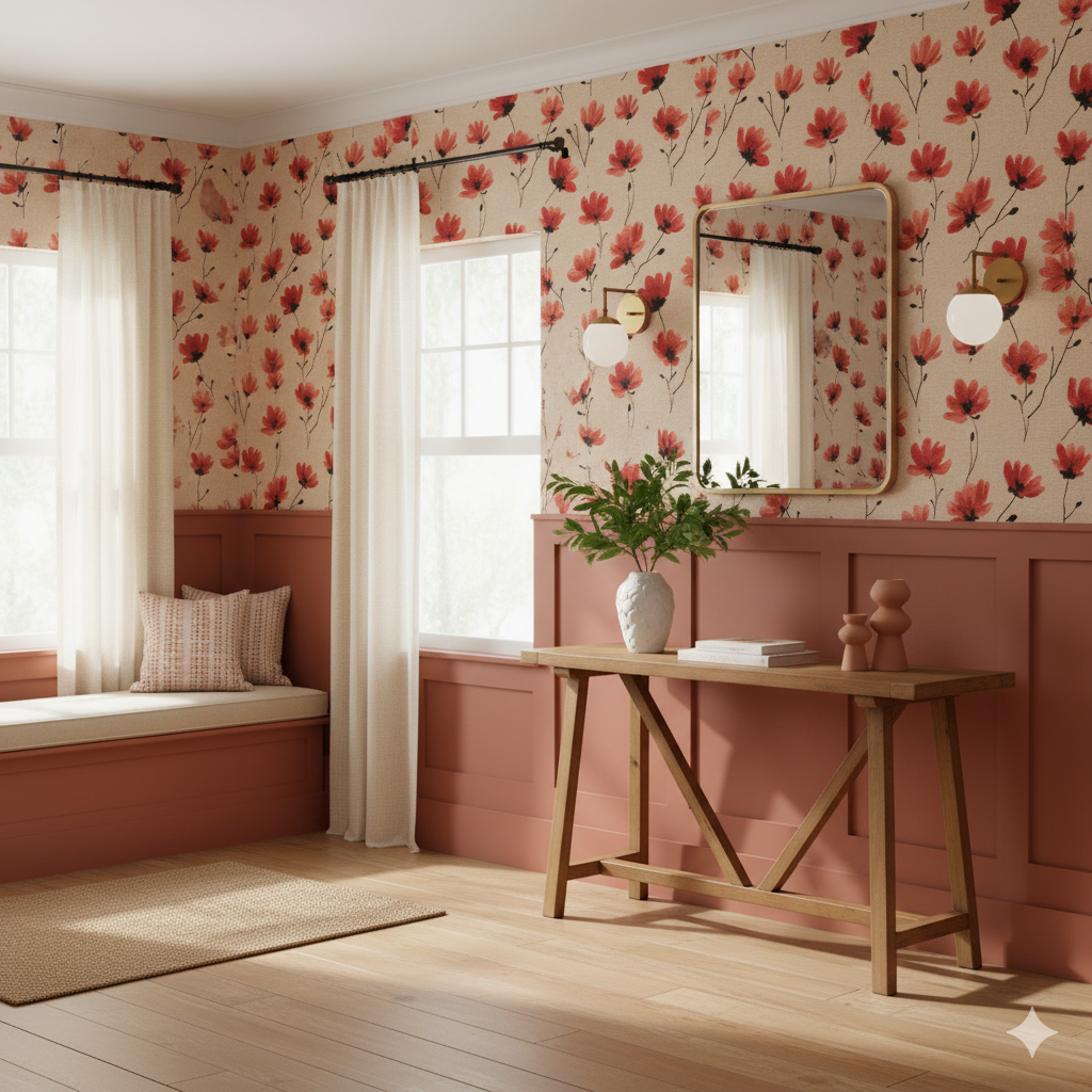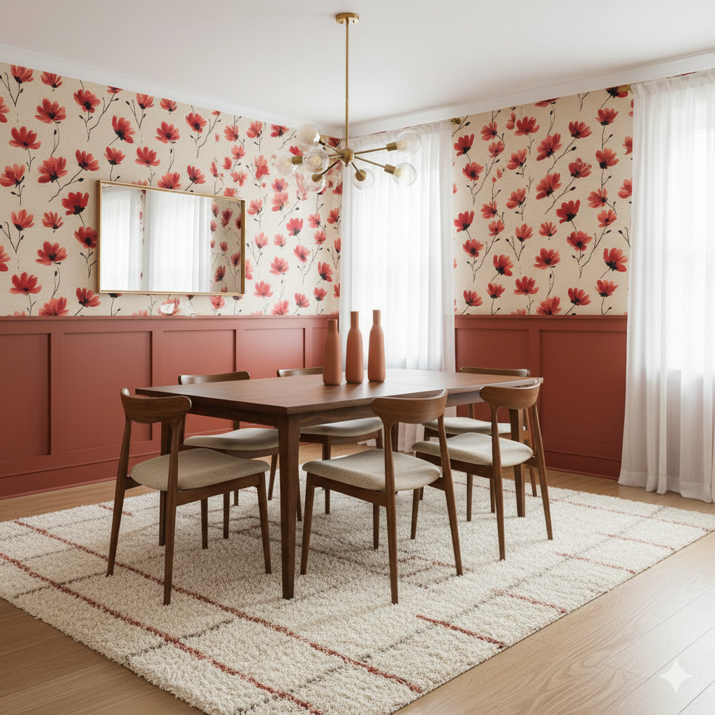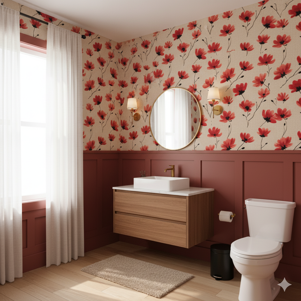 Alive with energy, this wallpaper channels the vibrancy of wild poppies caught in a sunlit field. Crimson red petals burst across the surface, their painterly strokes giving each flower an impressionistic, hand-rendered quality. Anchored by bold black centers and thin, gestural stems, the composition carries a free-spirited movement, like blossoms dancing in the wind. The warm beige backdrop softens the intensity of the palette, allowing the flowers to glow without overwhelming the eye. Carmine Bloom makes a statement in kitchens, dining rooms, or entryways, adding instant cheer and personality. Its painterly approach also lends itself to eclectic interiors where texture, art, and individuality are celebrated. Think modern farmhouse kitchens, creative studios, or gallery-inspired living spaces where this wallpaper can act as both backdrop and focal artwork.