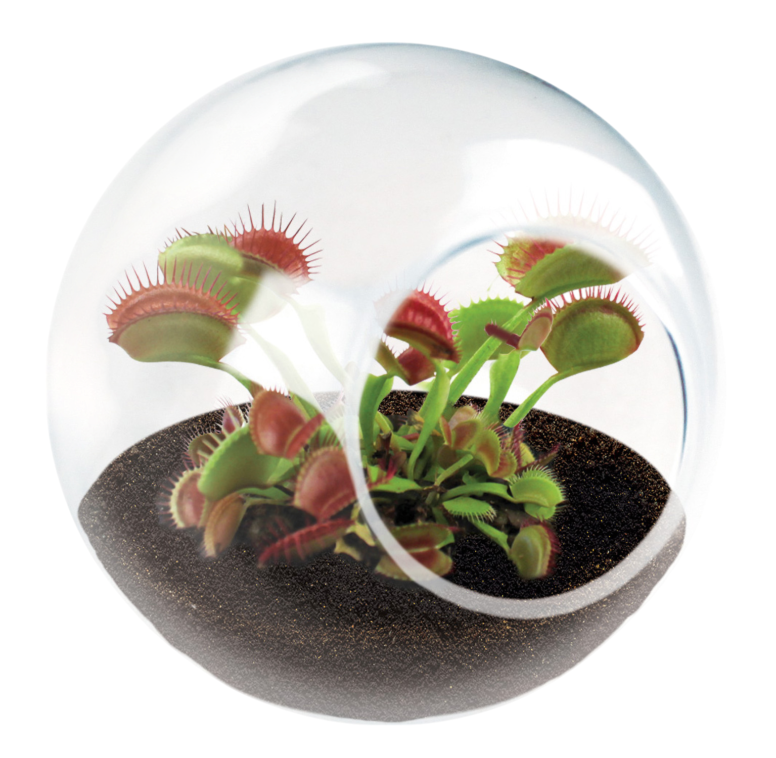 Grow your own tiny, self-contained eco system. Each high-quality globe is handmade. The Flytraps will naturally conform to the container and stay small while growing in it. However, they can grow to full size if they are transplanted into progressively larger containers. Flytraps can produce tall flower stalks that reach up to 12 inches in height, but they typically do not eat insects while flowering. Flytraps can live for several years with proper care. Sundew plants have many unique features to aid them in survival. They have sticky leaves that work to trap insects, tentacle-like leaf hairs that move to ensnare prey, and deadly digestive juices that produce enzymes to break down the bodies of the insects the plant captures. Instructions included. Guaranteed to Grow! Must use distilled water – avoid tap water.