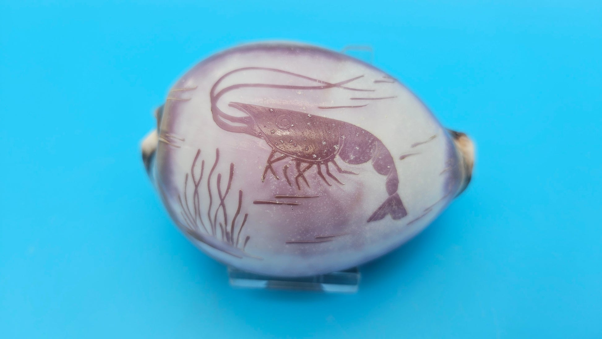 Add a touch of whimsy to your coastal decor with these hand-carved cowrie display shells. Each shell features a unique ocean-inspired scene—choose from dolphin, seahorse, or shrimp designs. With their glossy finish and soft lavender tones, they make a charming addition to bookshelves, side tables, or coastal vignettes.