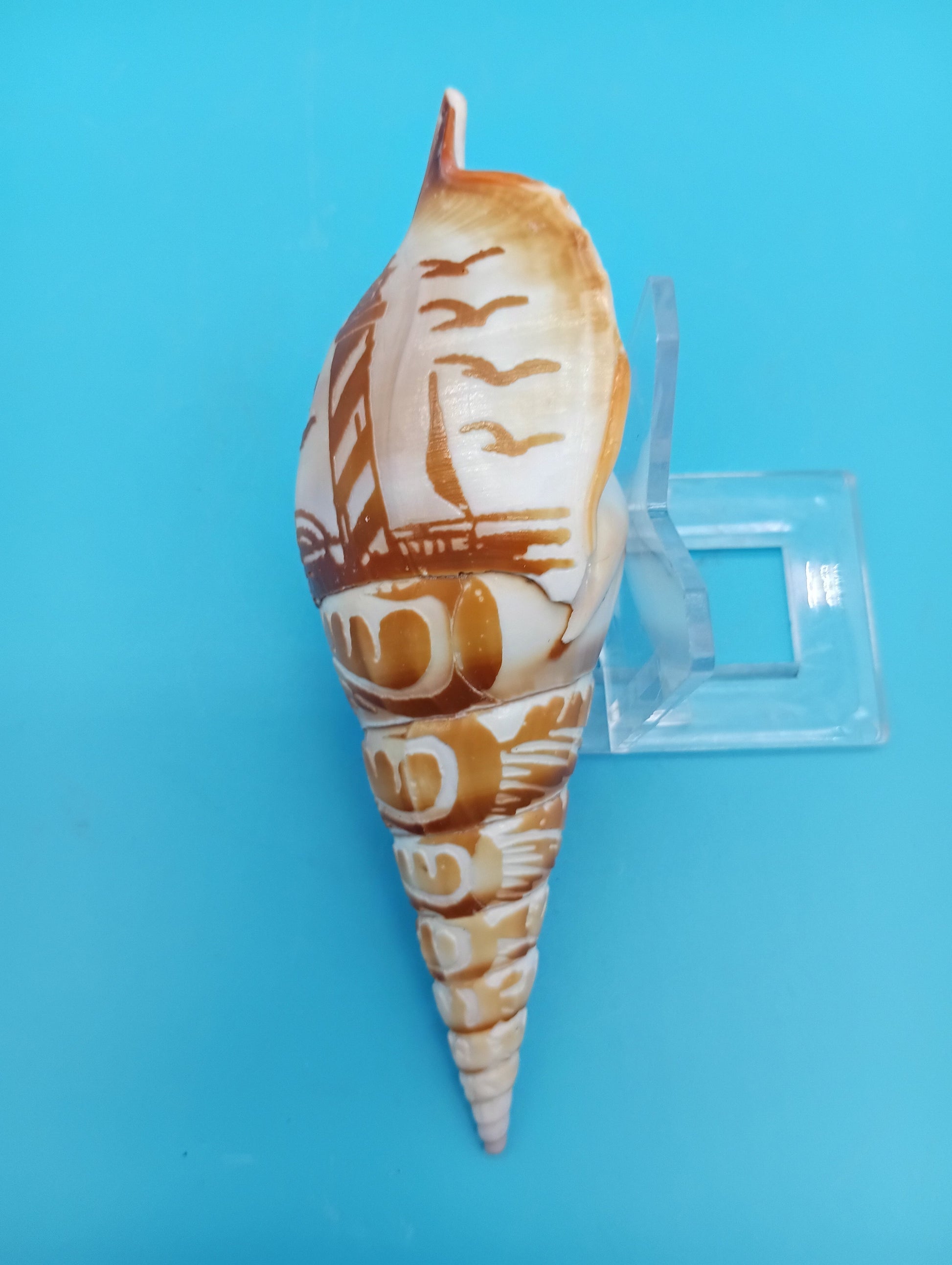 This beautifully hand-carved Tibia shell showcases a detailed lighthouse scene complete with seabirds and waves, transforming a natural shell into a piece of coastal art. The shell’s natural warm tones and glossy finish enhance the intricate carving, making it a perfect statement piece for collectors and coastal home décor lovers alike.
