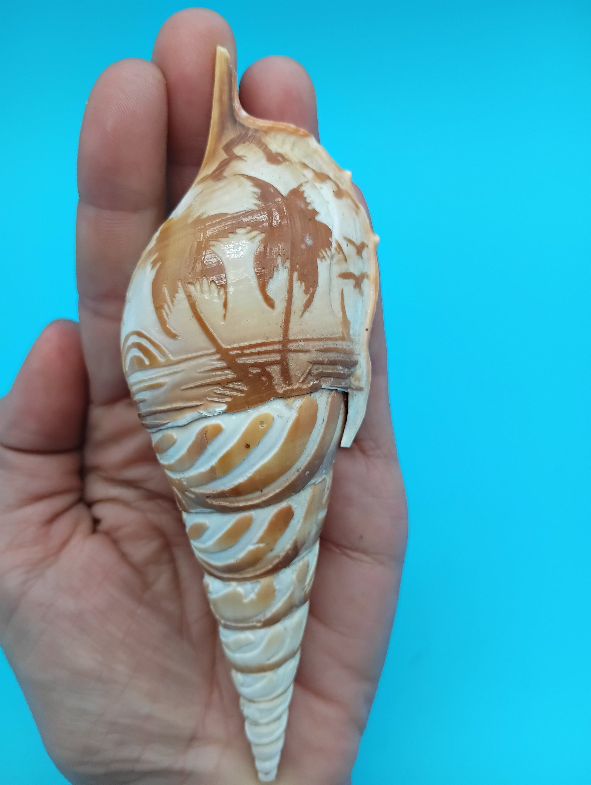 This beautifully hand-carved Tibia shell features an intricate palm tree scene, complete with birds and a coastal backdrop, turning a natural shell into a unique piece of nautical art. The warm brown and ivory tones of the shell’s natural surface highlight the carving, making it an eye-catching addition to any coastal home décor or shell collection.