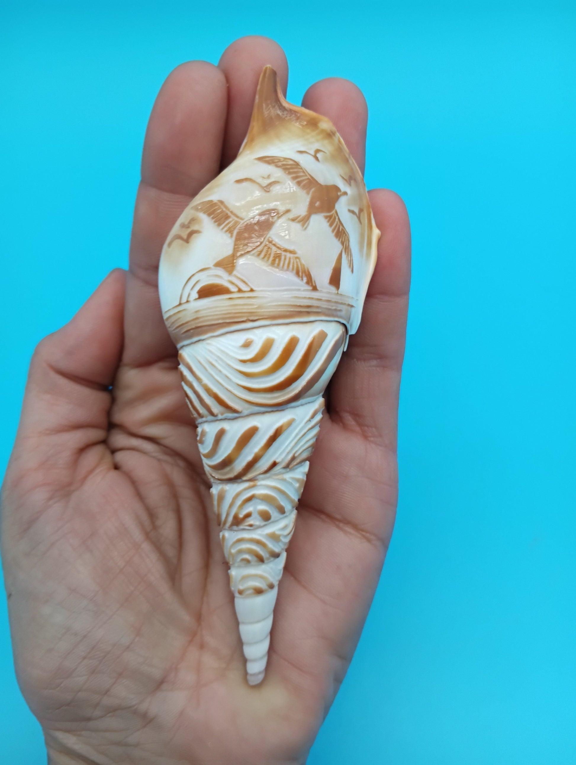 This beautifully hand-carved Tibia shell features a detailed seagull scene, complete with coastal accents that transform the natural shell into a piece of seaside art. The warm ivory and brown tones of the Tibia shell highlight the carving, making it a striking addition to any coastal home décor or shell collection.