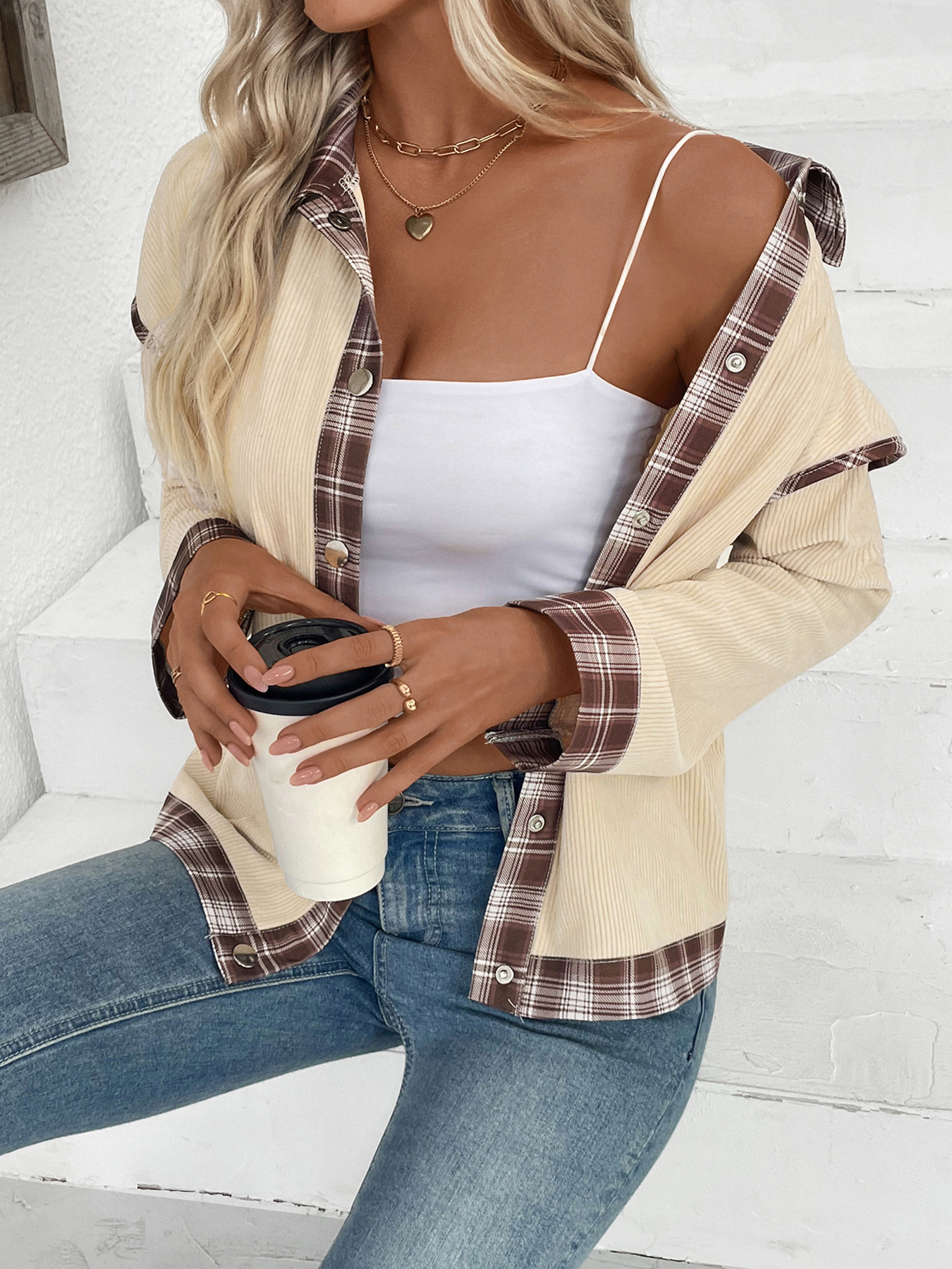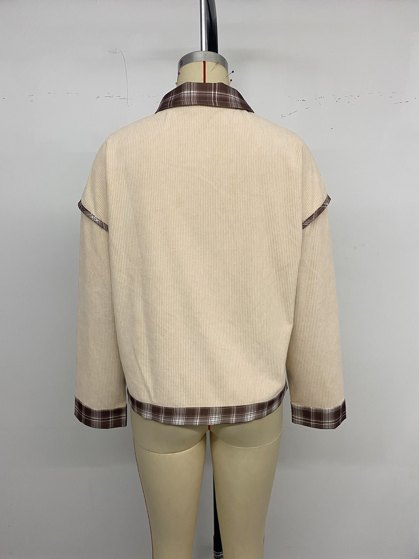Casual Retro Collared Plaid Corduroy Stitching Autumn Women Jacket